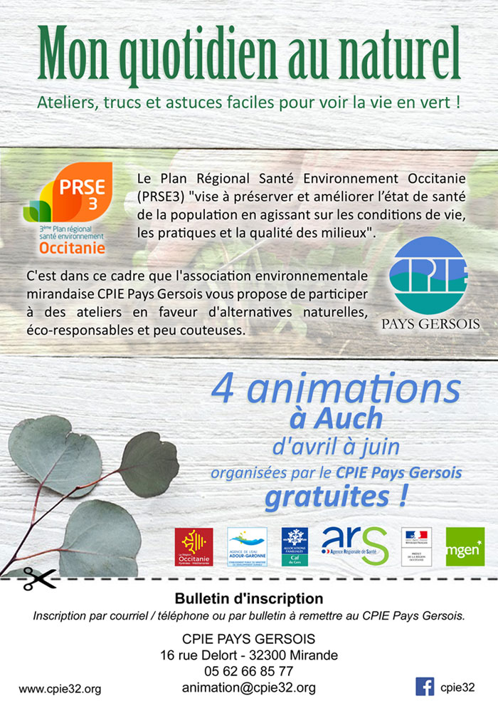 Le Plan Régional Santé Environnement Occitanie (PRSE3) « vise à préserver et améliorer l’état de santé de la population en agissant sur les conditions de vie, les pratiques et la qualité des milieux ». C’est dans ce cadre que le CPIE Pays Gersois vous propose de participer au projet Mon quotidien au naturel, 4 ateliers gratuits en faveur d’alternatives naturelles, éco-responsables et peu coûteuses, à Auch.