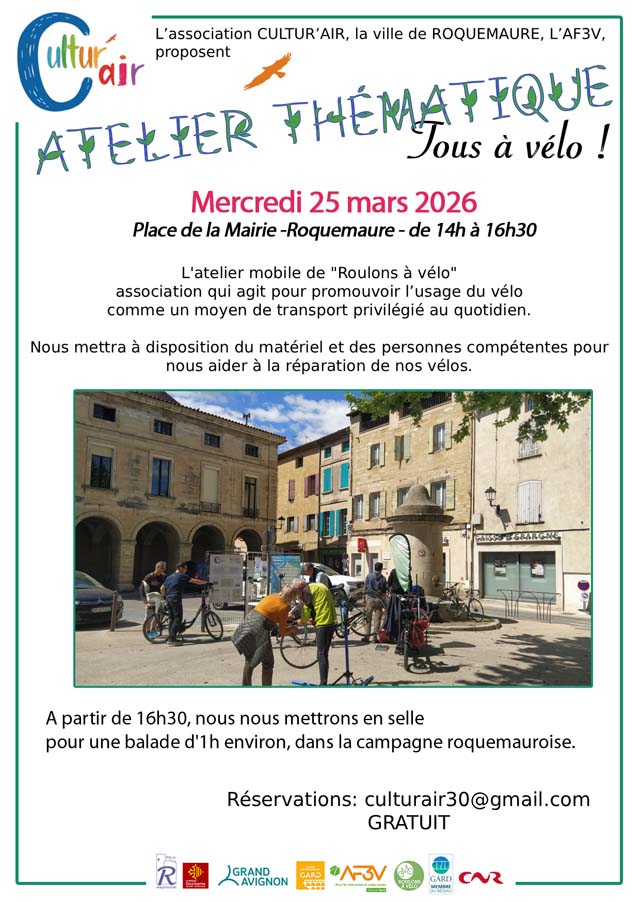 Le mercredi 25 mars 2026, l’atelier mobile « Roulons à Vélo » met à disposition le matériel et des personnes compétentes pour nous aider à la réparation des vélos.