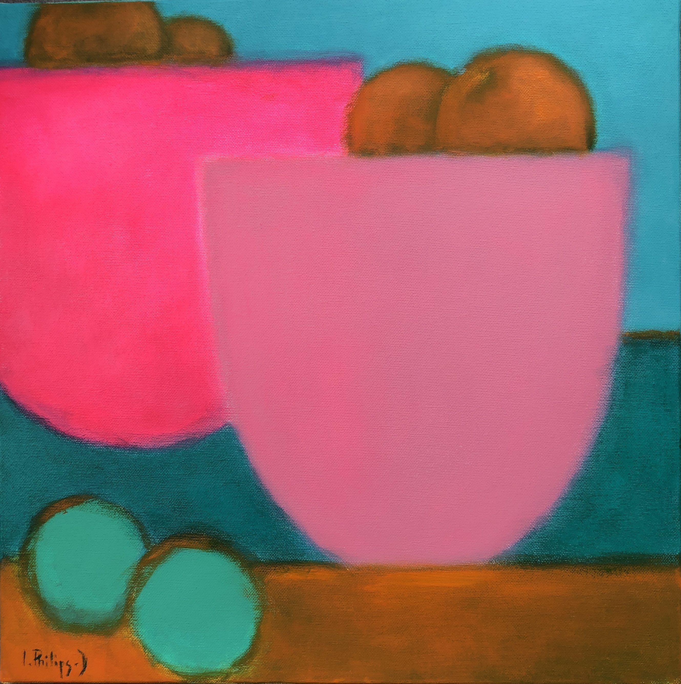 Actuellement je peins des natures mortes épurées, des formes simples qui me permettent d’explorer toujours plus l’étendue des harmonies de couleurs …