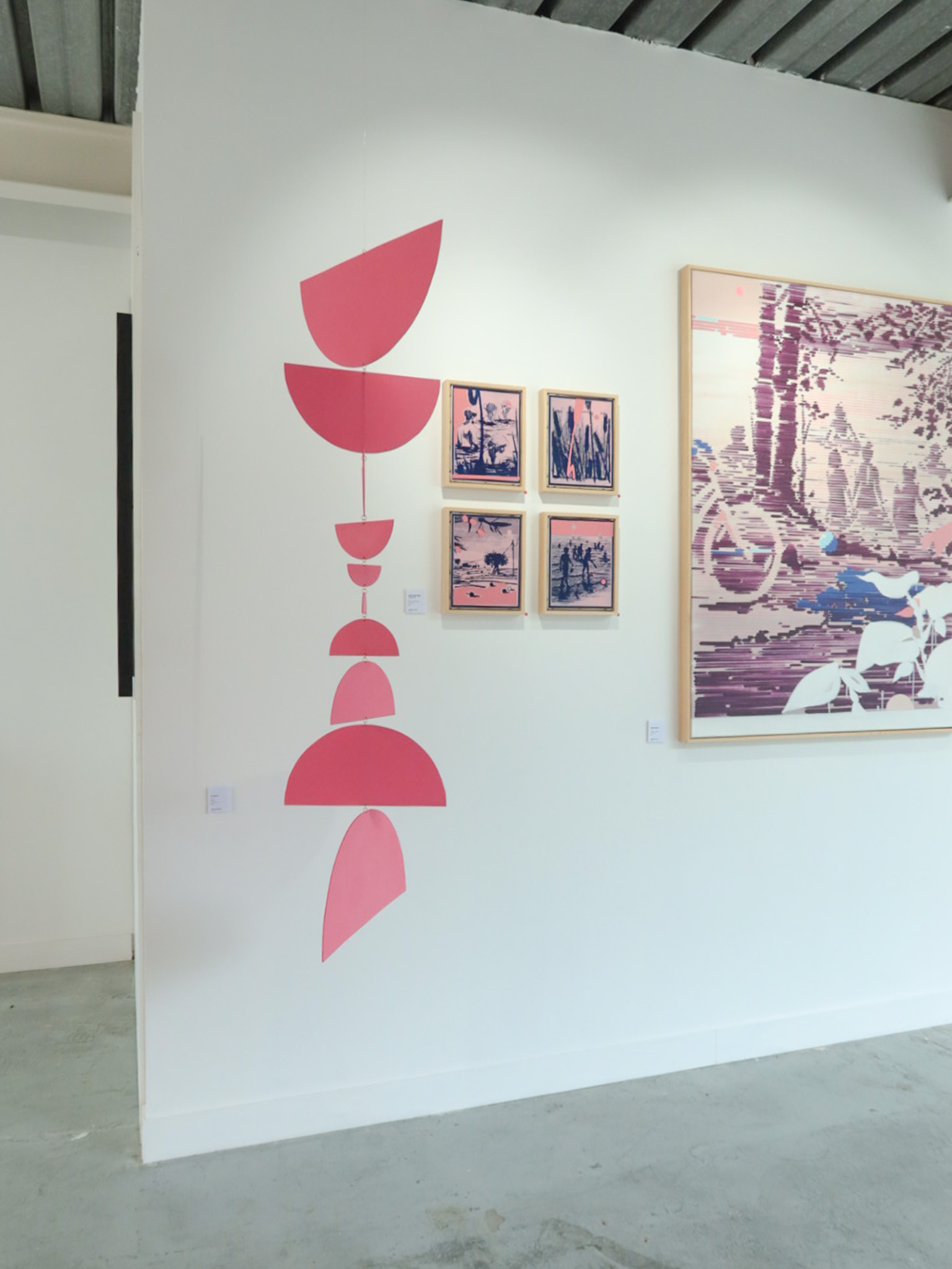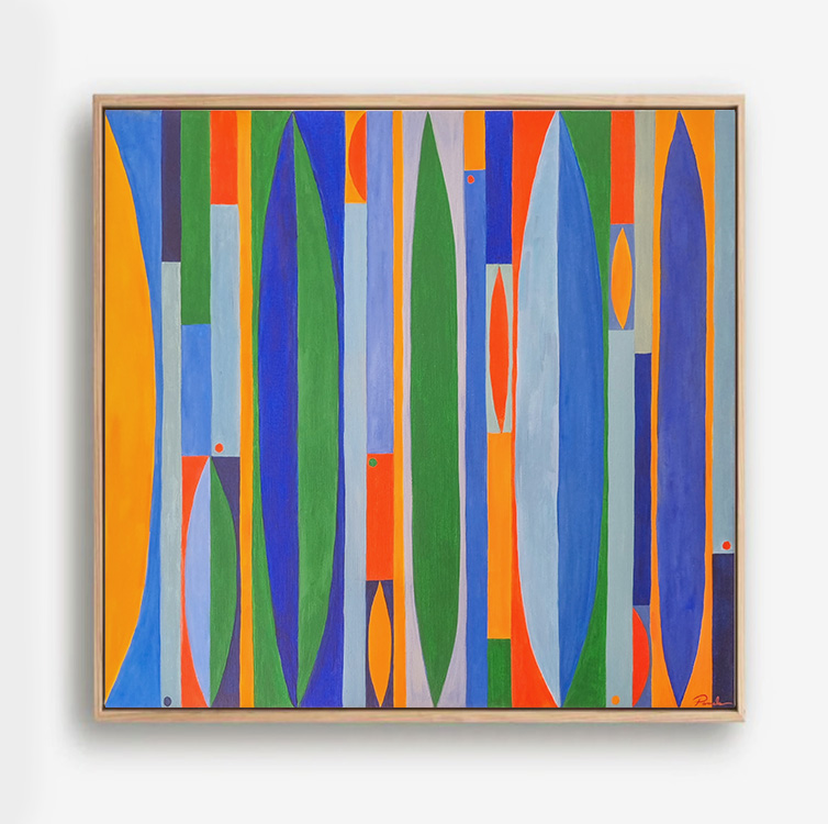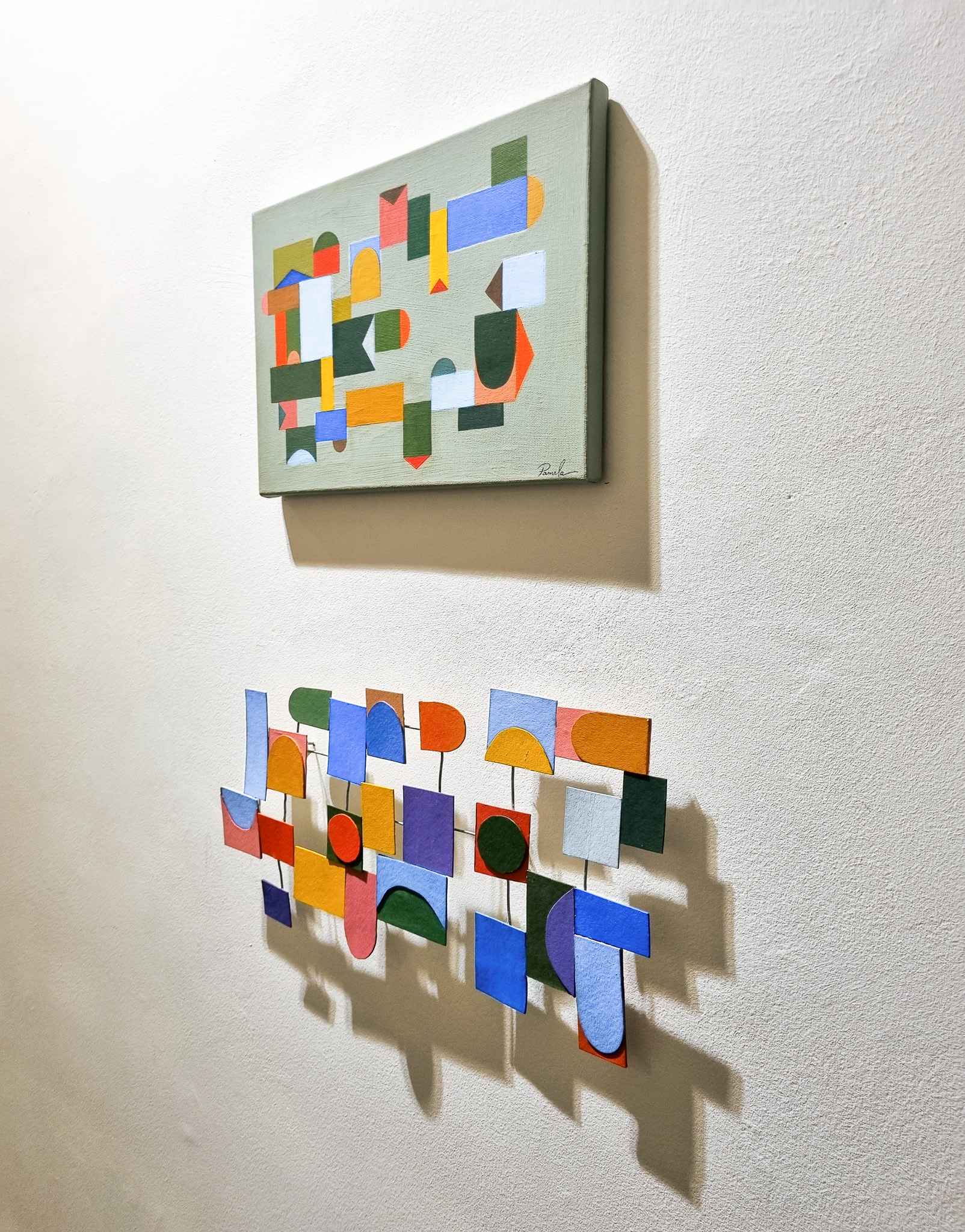 La composition géométrique fonctionne comme un principe d’organisation et de relation. Fragments, trames et modules se juxtaposent, s’emboîtent ou se sectionnent, créant des structures qui suggèrent des articulations, des ruptures, mais aussi des recompositions. La couleur agit comme un élément structurant, définissant des champs, des volumes et des rythmes visuels qui modèlent l’espace et construisent des liens entre les formes, l’artiste et le spectateur.