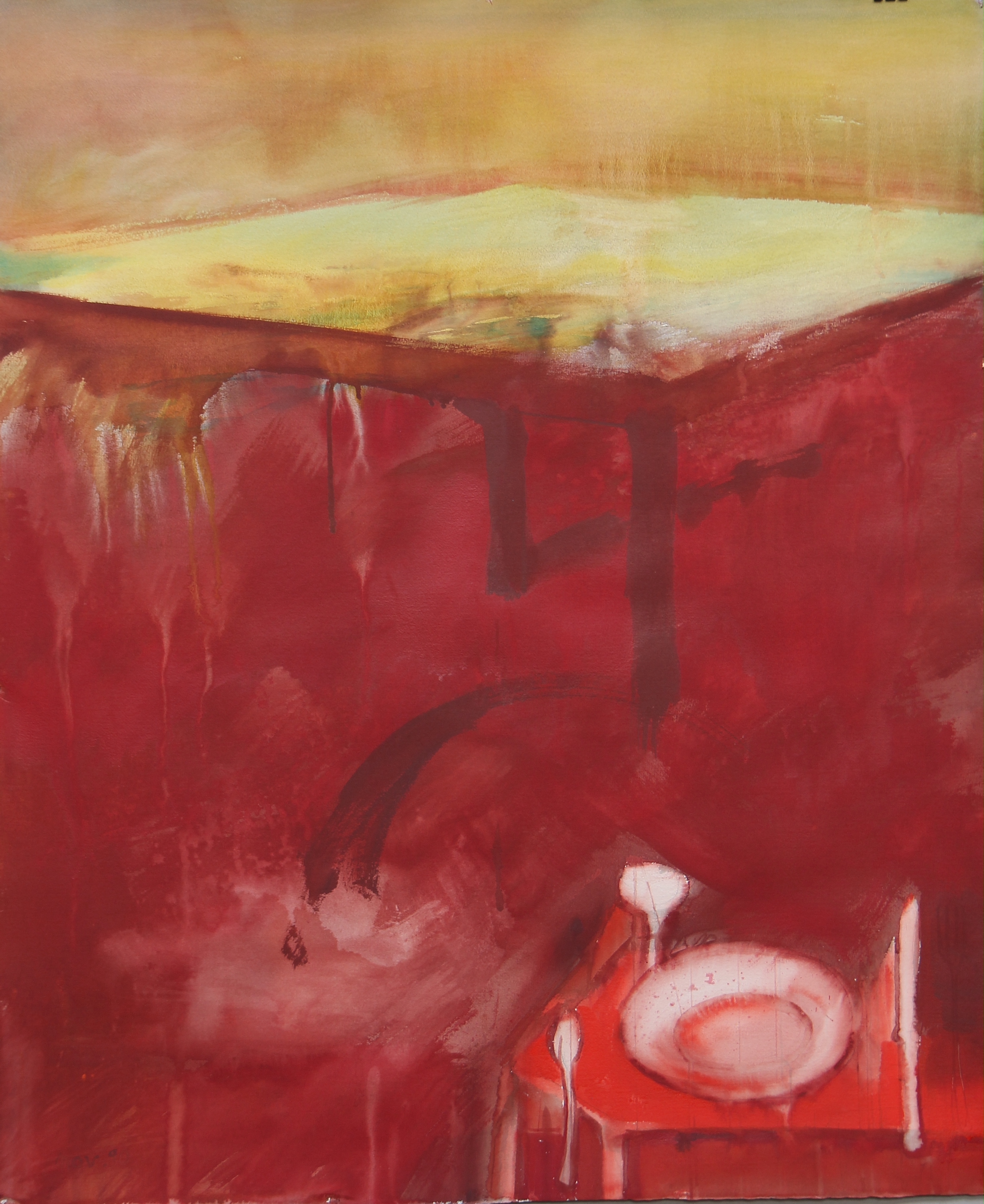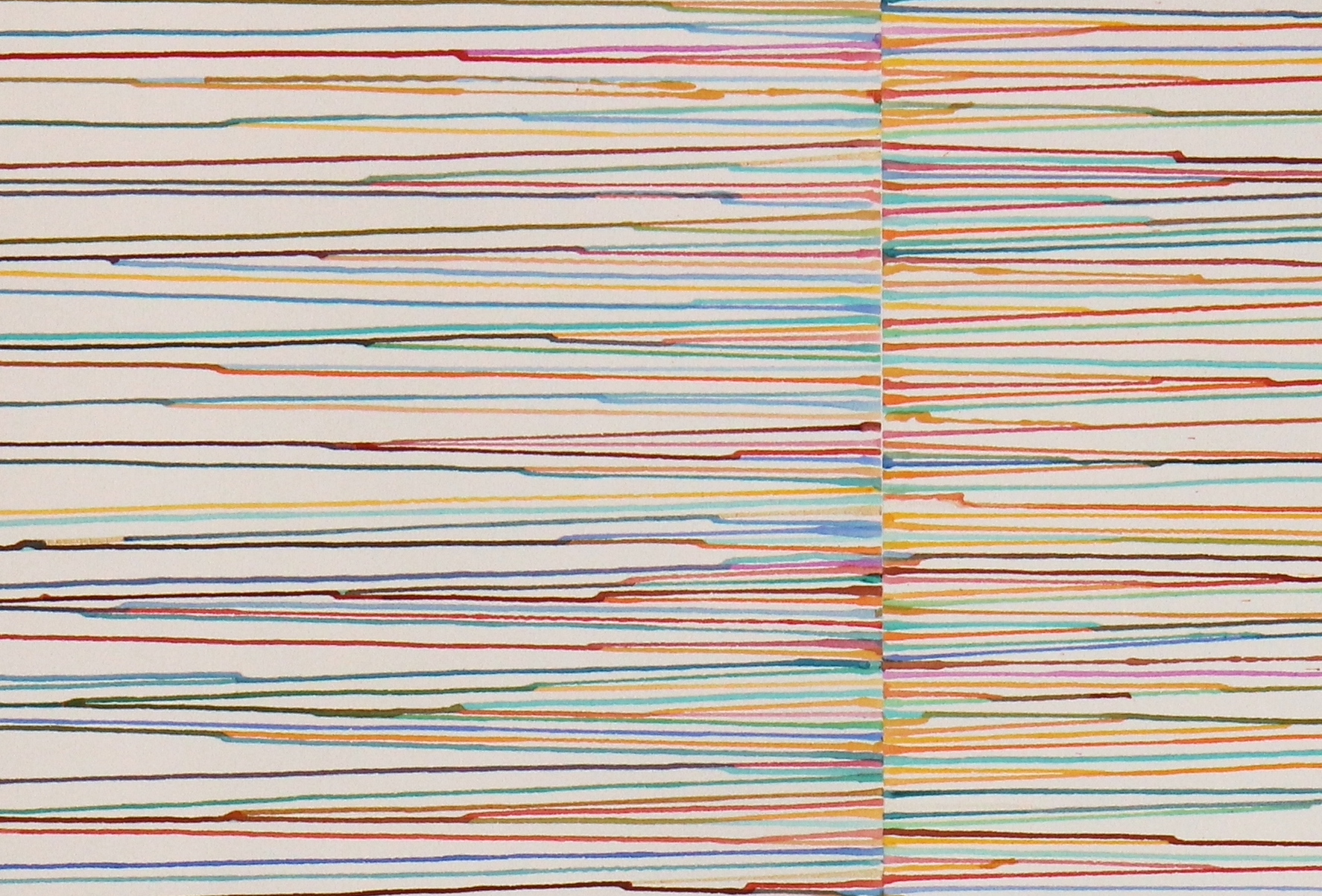 Dans la série Coulures, il explore une facette singulière de l’aquarelle. C’est un usage ludique mais contrôlé de la goutte d’eau dévalant la feuille de papier. Il cherche à en utiliser la potentialité sur de grands formats permettant un jeu complexe de forme et de couleur.
