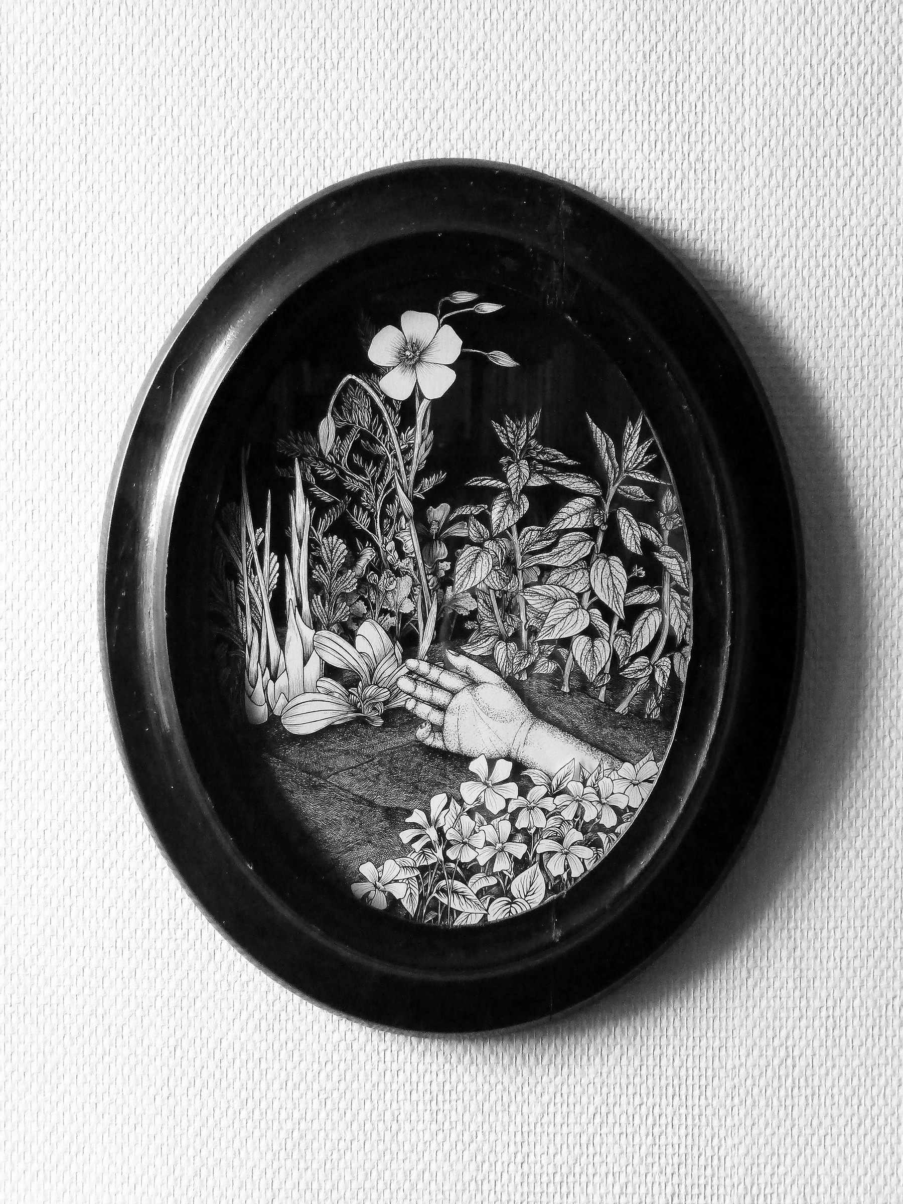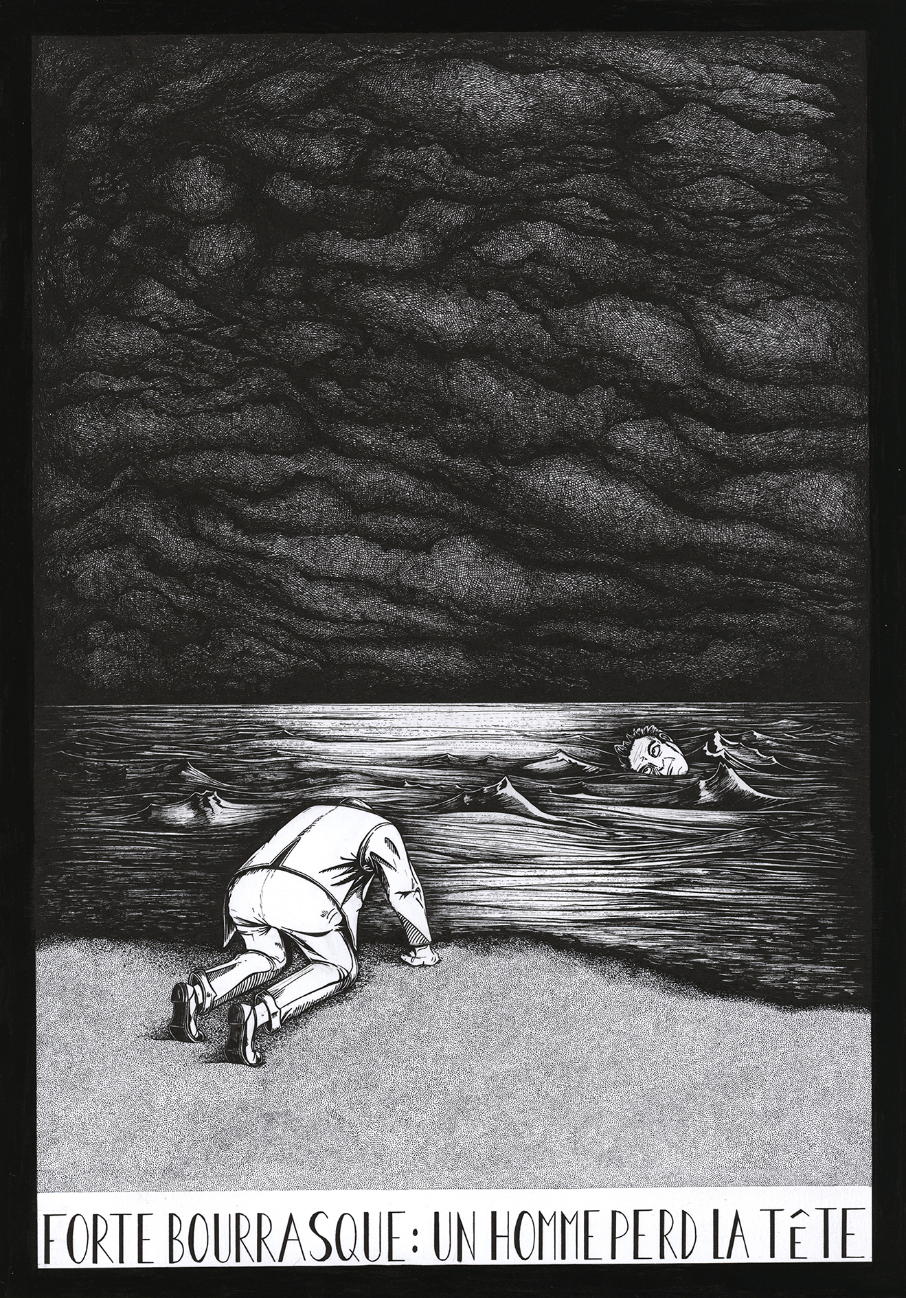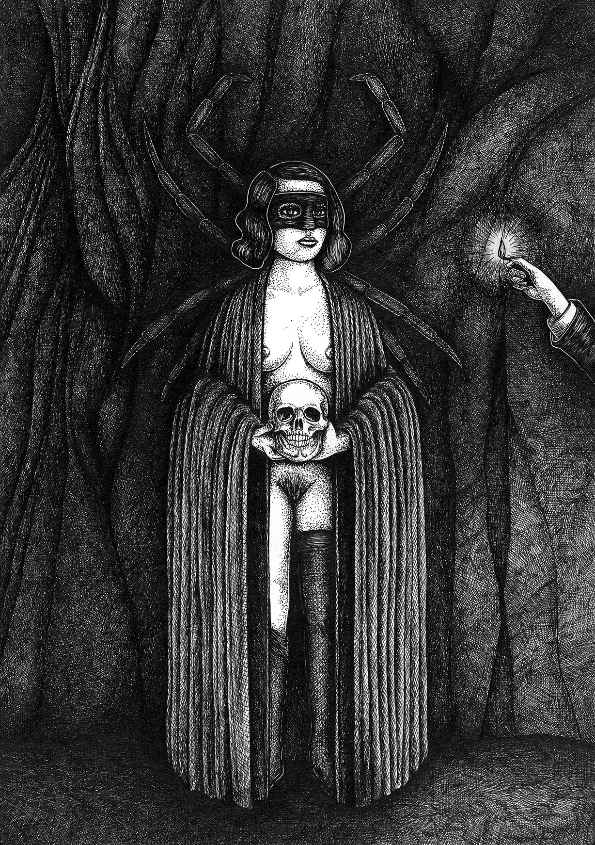 Le noir et blanc est omniprésent dans mes dessins, je tisse des toiles d’encre en superposant les traits de façon compulsive et en amassant les petits points cherchant à donner corps à mes obsessions.