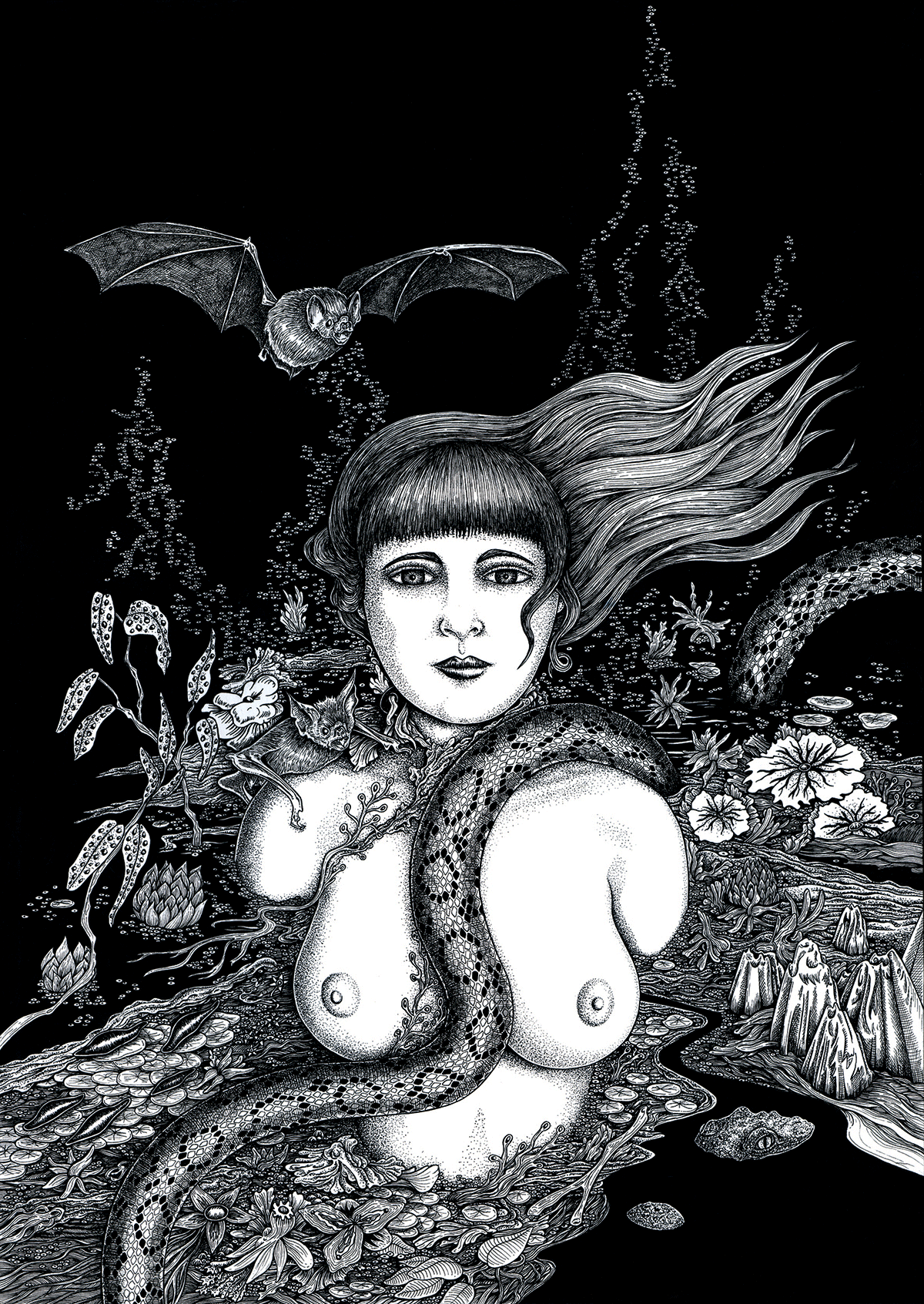Fantasmes nocturnes, présences invisibles, bestiaire monstrueux et féminité érotisée, la plupart de mes dessins naissent de mes propres rêves et cauchemars que je note dans un carnet dès que je le peux.