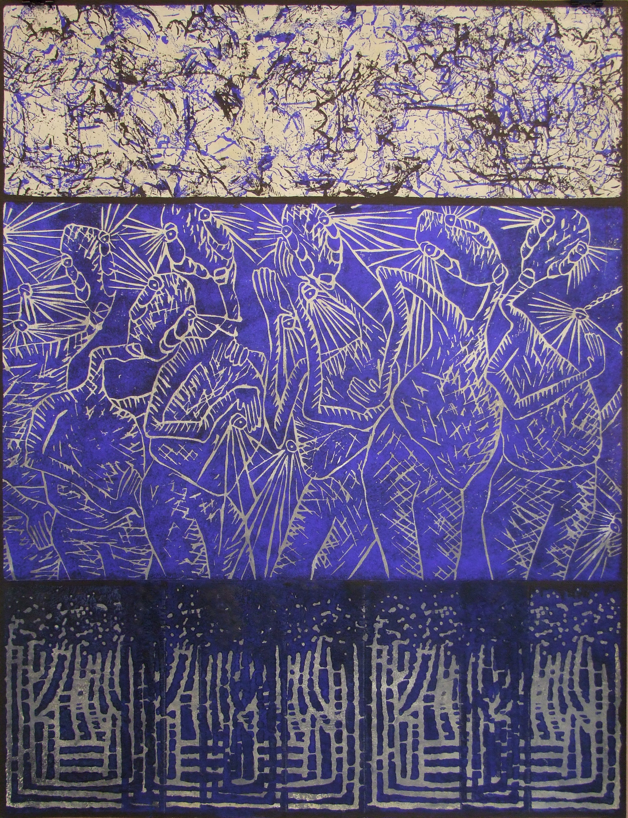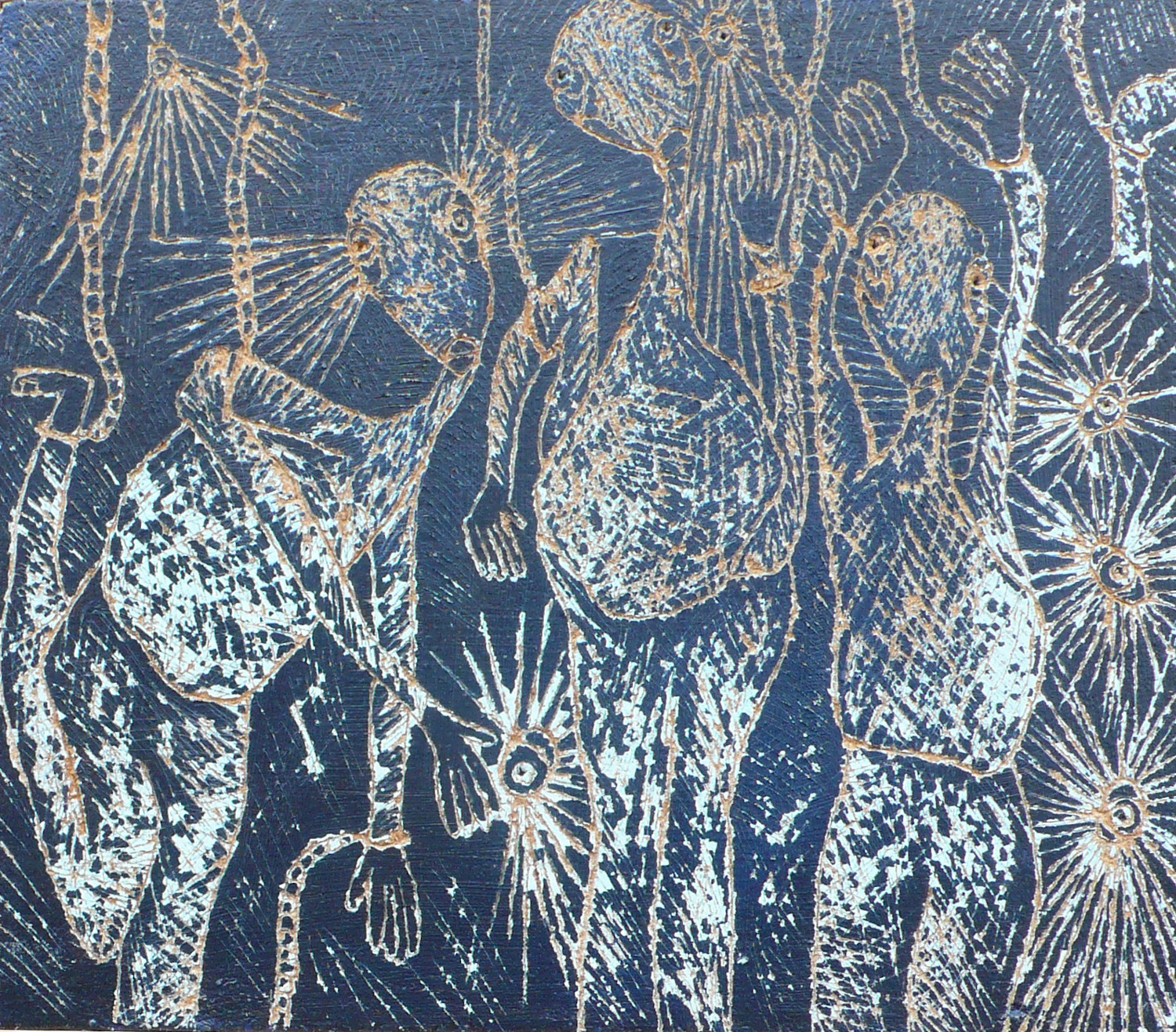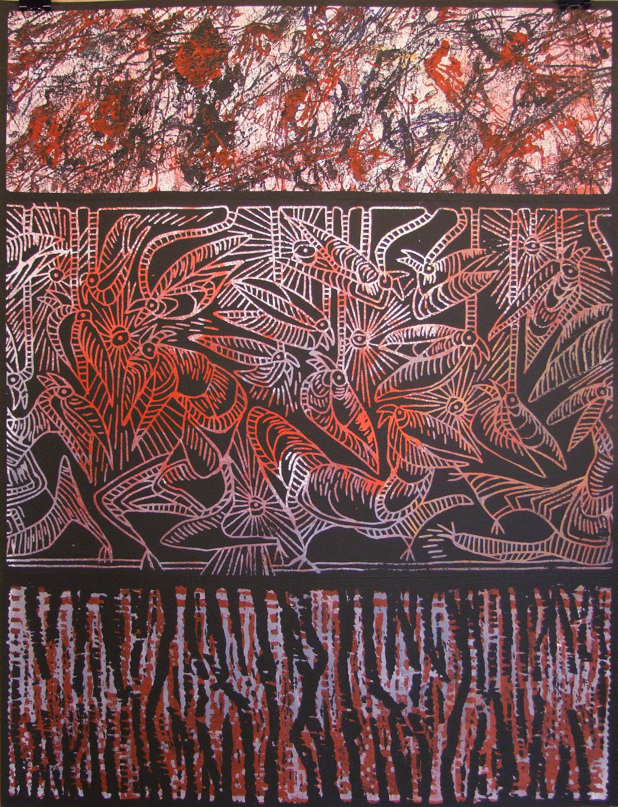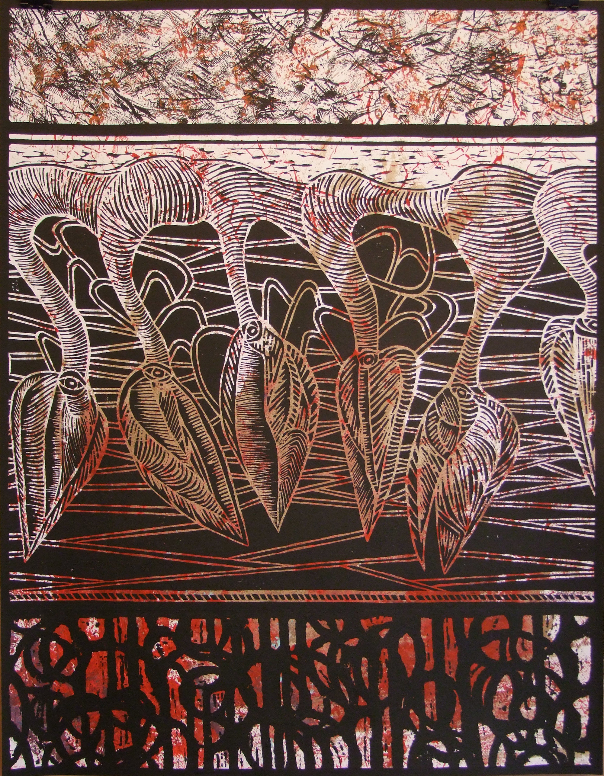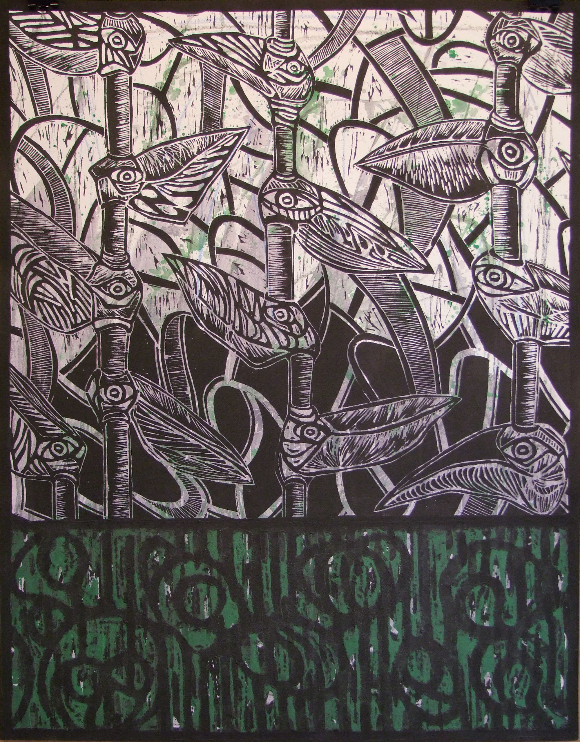 Graver avec mes gouges la matière se commence dans un coin de la plaque pour se terminer dans l’autre avec une idée vague de départ. Une forme en appel une autre, elles s’imbriquent naturellement les unes après les
