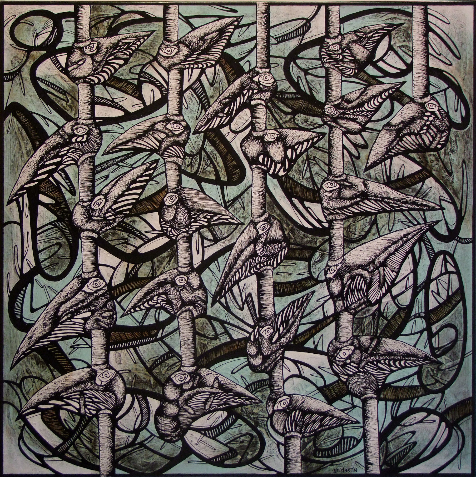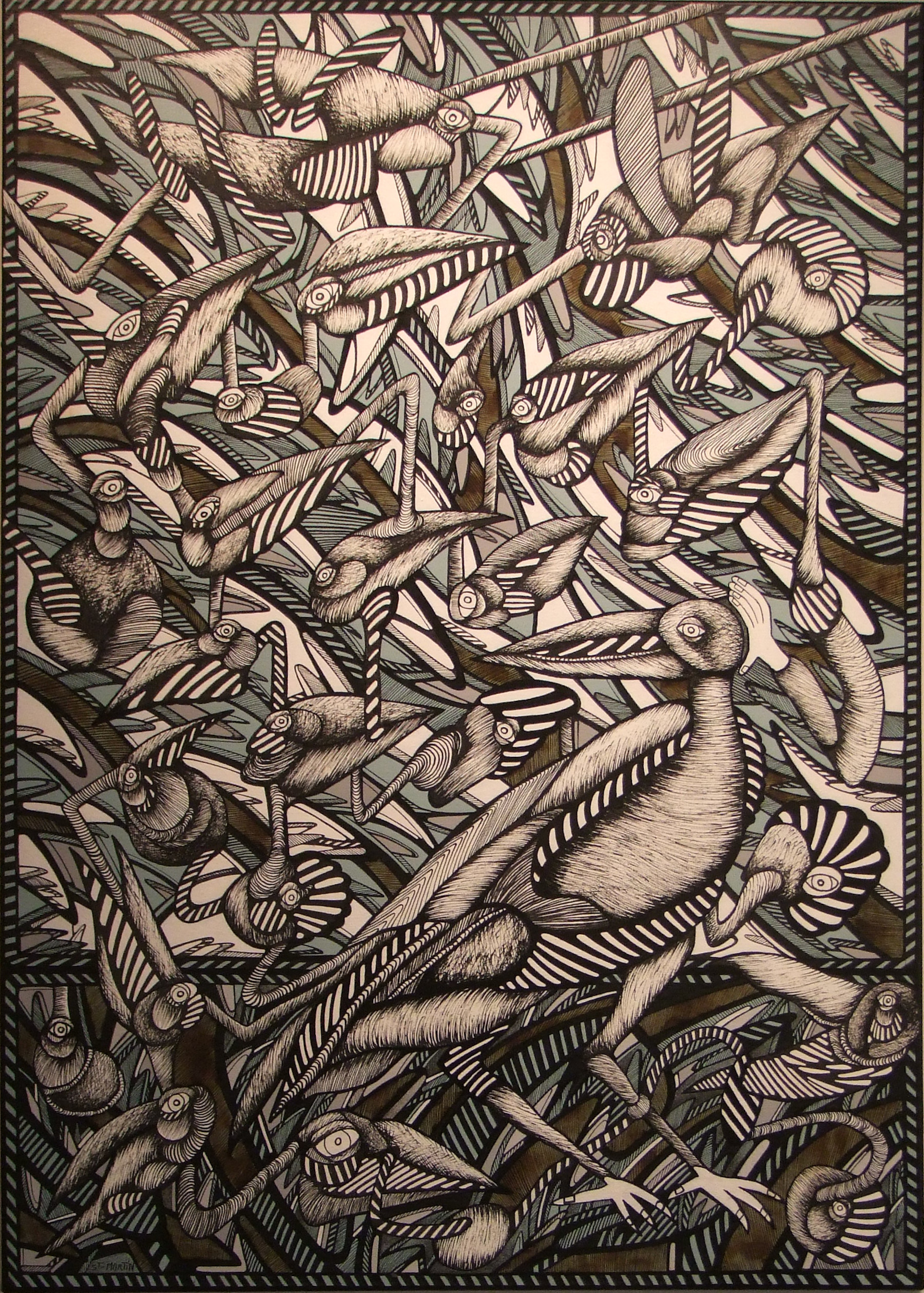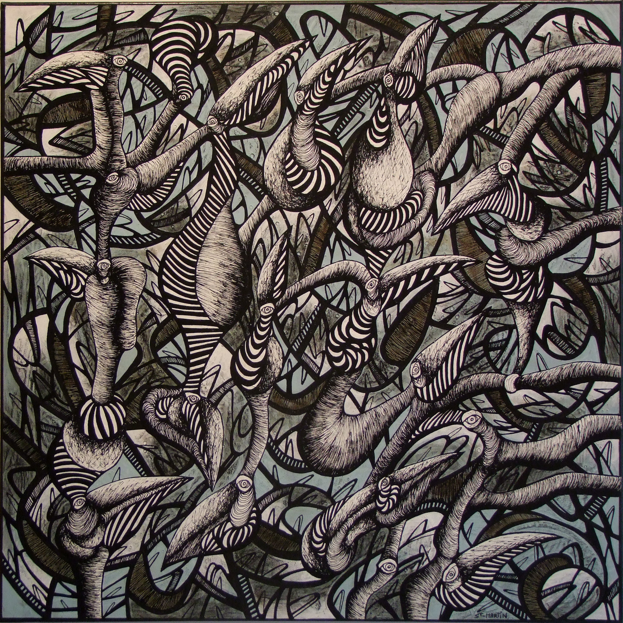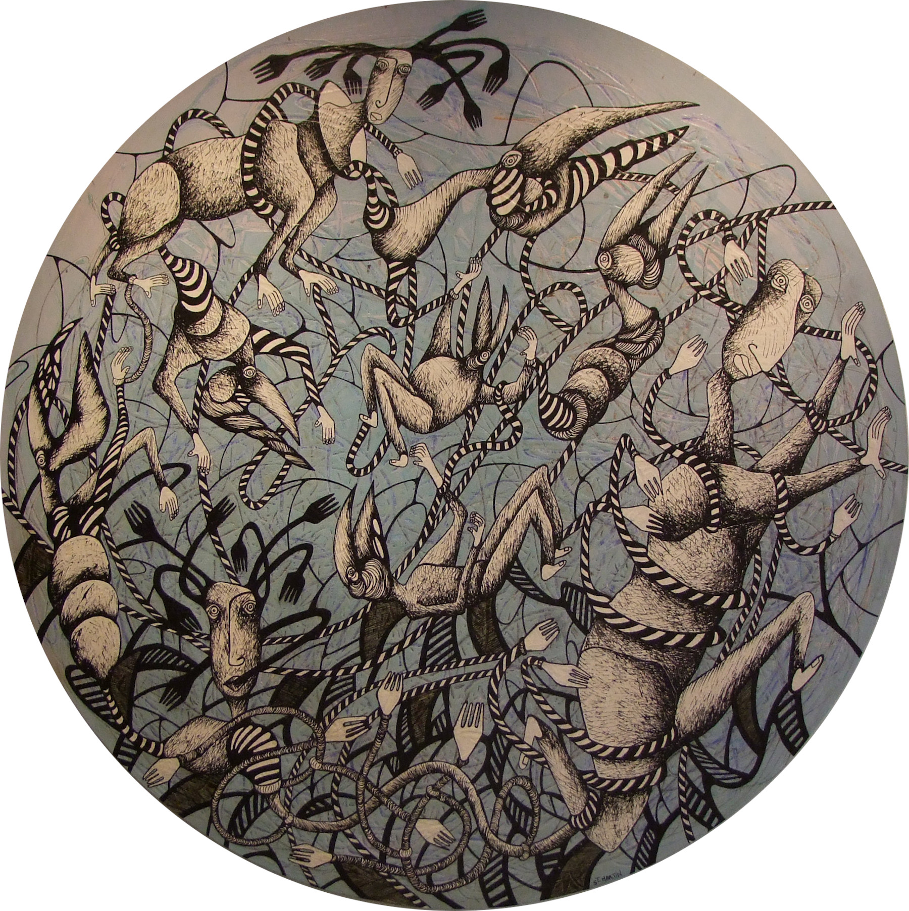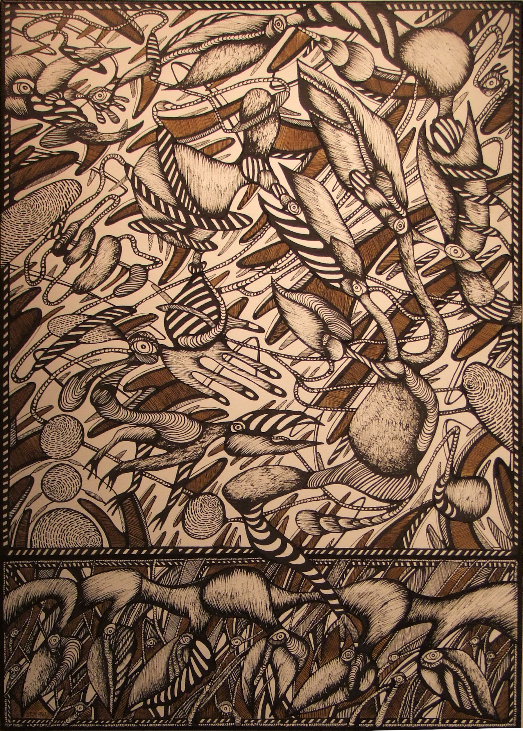 Mon travail est le reflet de mes impressions à travers un environnement d’images, d’ambiances, de personnages et de bestioles qui passent à travers moi, les formes se mélangeant spontanément.