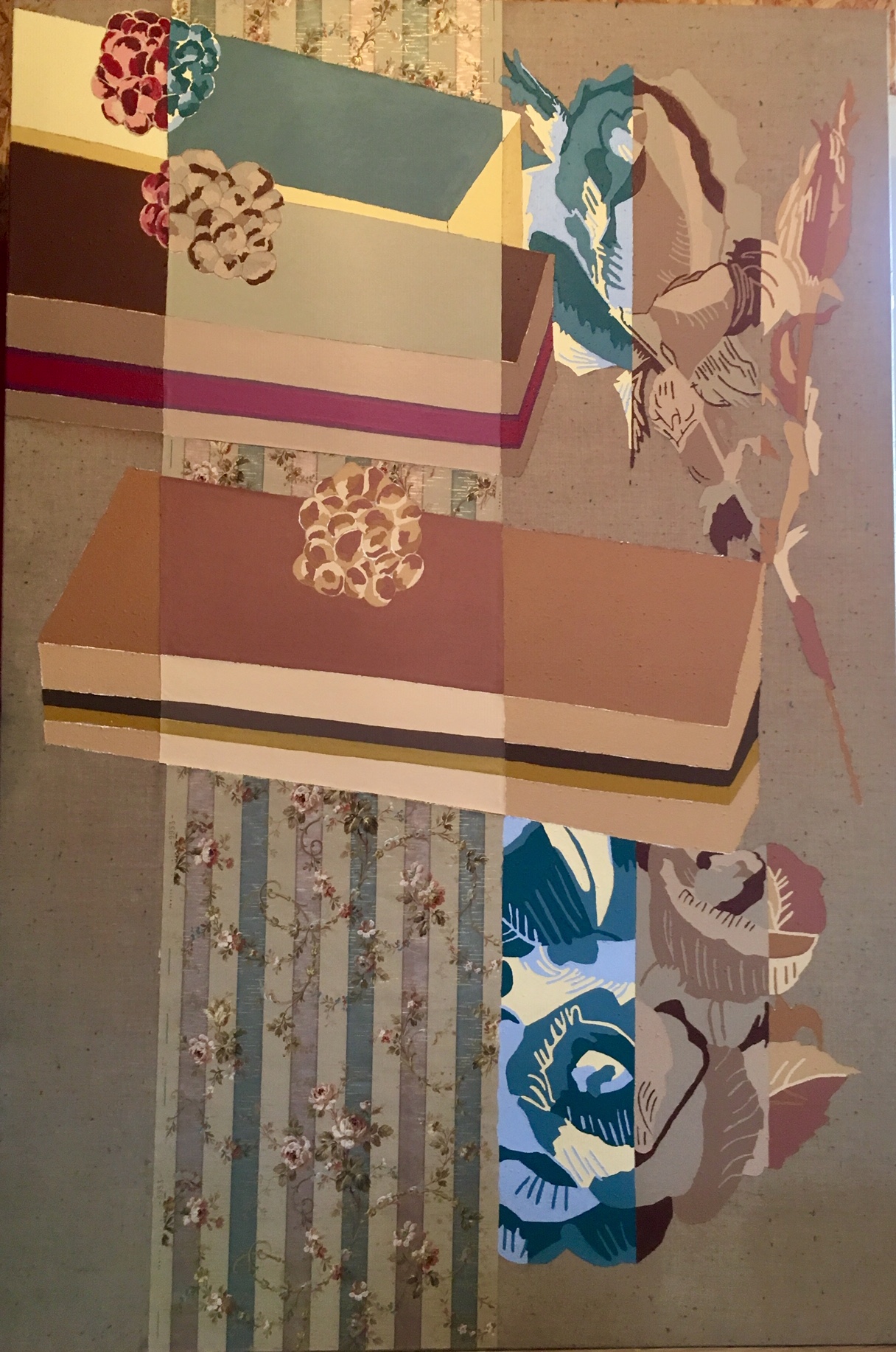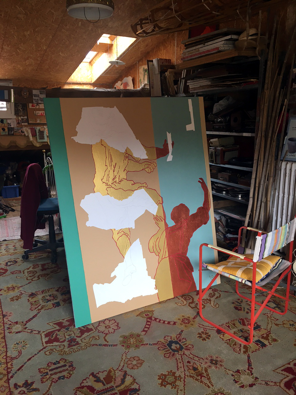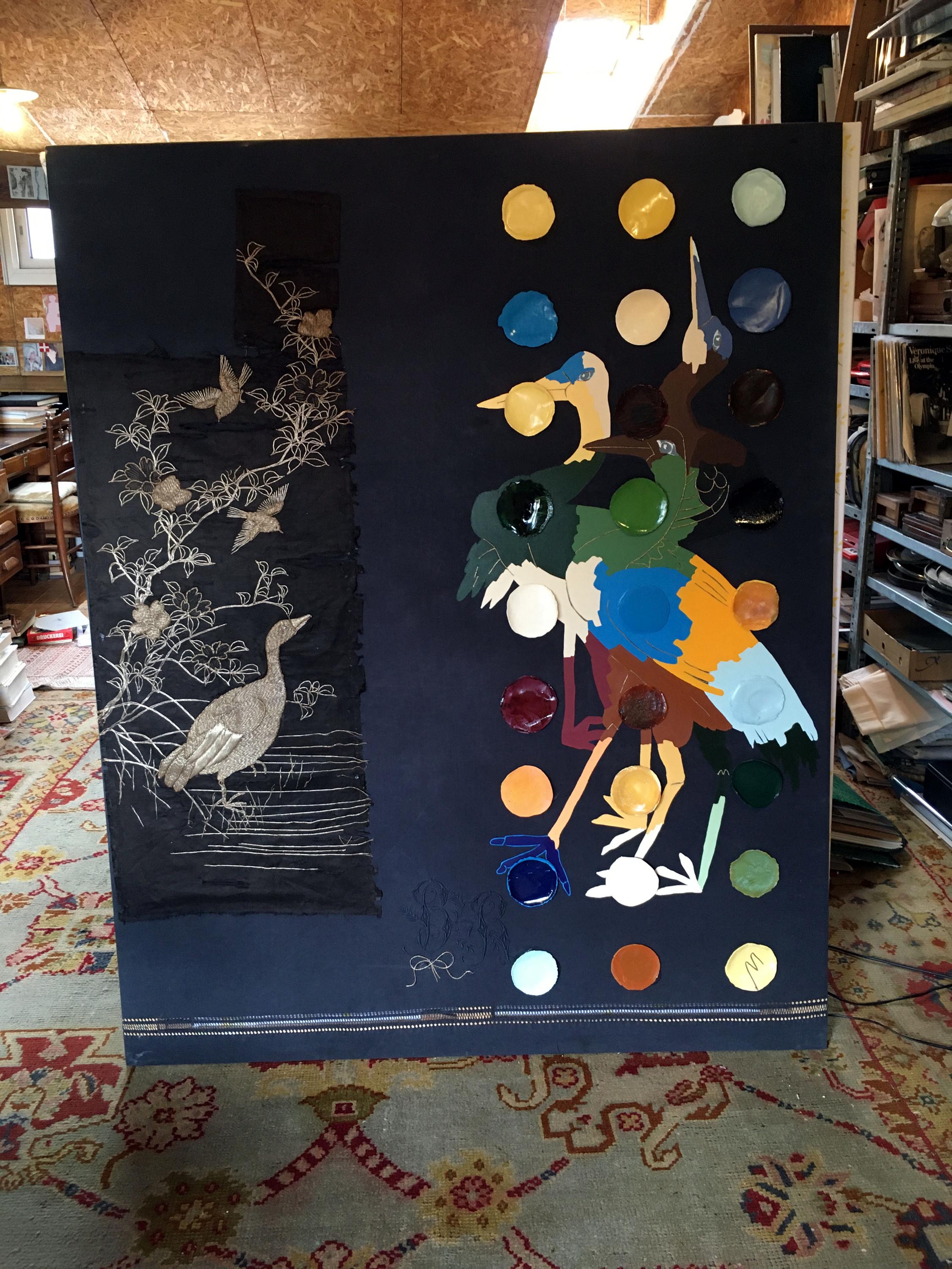 Draps en guise de toile parce que ça fonctionne ; cartons durs pour des supports fins et légers qui prennent moins d’importance qu’un cadre lourd visuellement.