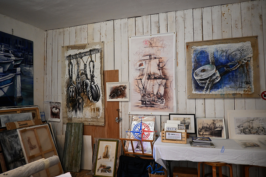 Mon atelier est exclusivement un lieu de travail, aménagé en lieu d’exposition à l’occasion des portes ouvertes. Les voiles peintes et autres pièces sont exposées et mises en valeur, les carnets de voyage originaux pourront être consultés, les livres édités également. Je serais ravie d’échanger avec le public sur ma vie embarquée et mon travail, et plus encore. Je vous attends !