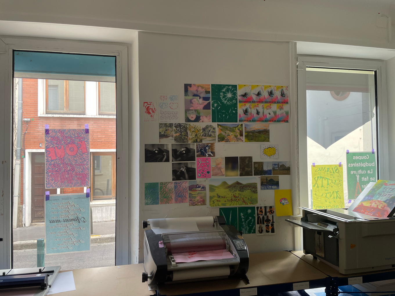 Notre atelier, ouvert depuis novembre 2024, réunit quatre artistes qui développent chacun·e une pratique singulière : graphisme et impression risographique, scénographie et illustration, bande dessinée et art visuel (vidéo et photographie). C’est un espace de travail partagé où nos recherches individuelles se nourrissent de dialogues, d’expérimentations et d’échanges. Notre espace nous permet d’envisager des moments d’expositions, de rencontre et d’ateliers.