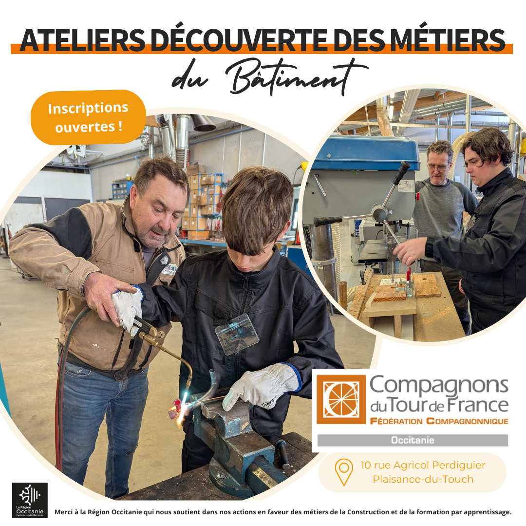 Site web : https://toulouse.compagnonsdutourdefrance.org/evenement/ateliers-decouverte-des-metiers-du-batiment/