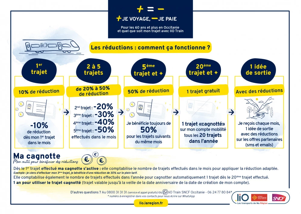 Plus je voyage, moins je paie : c’est le principe du dispositif « +=- ». Lancé par la Région, il permet aux 60 ans et plus, habitant dans la région, de se déplacer dans toute l’Occitanie, en économisant jusqu’à la moitié du prix du billet, sans limitation sur les gares de départ et d’arrivée.