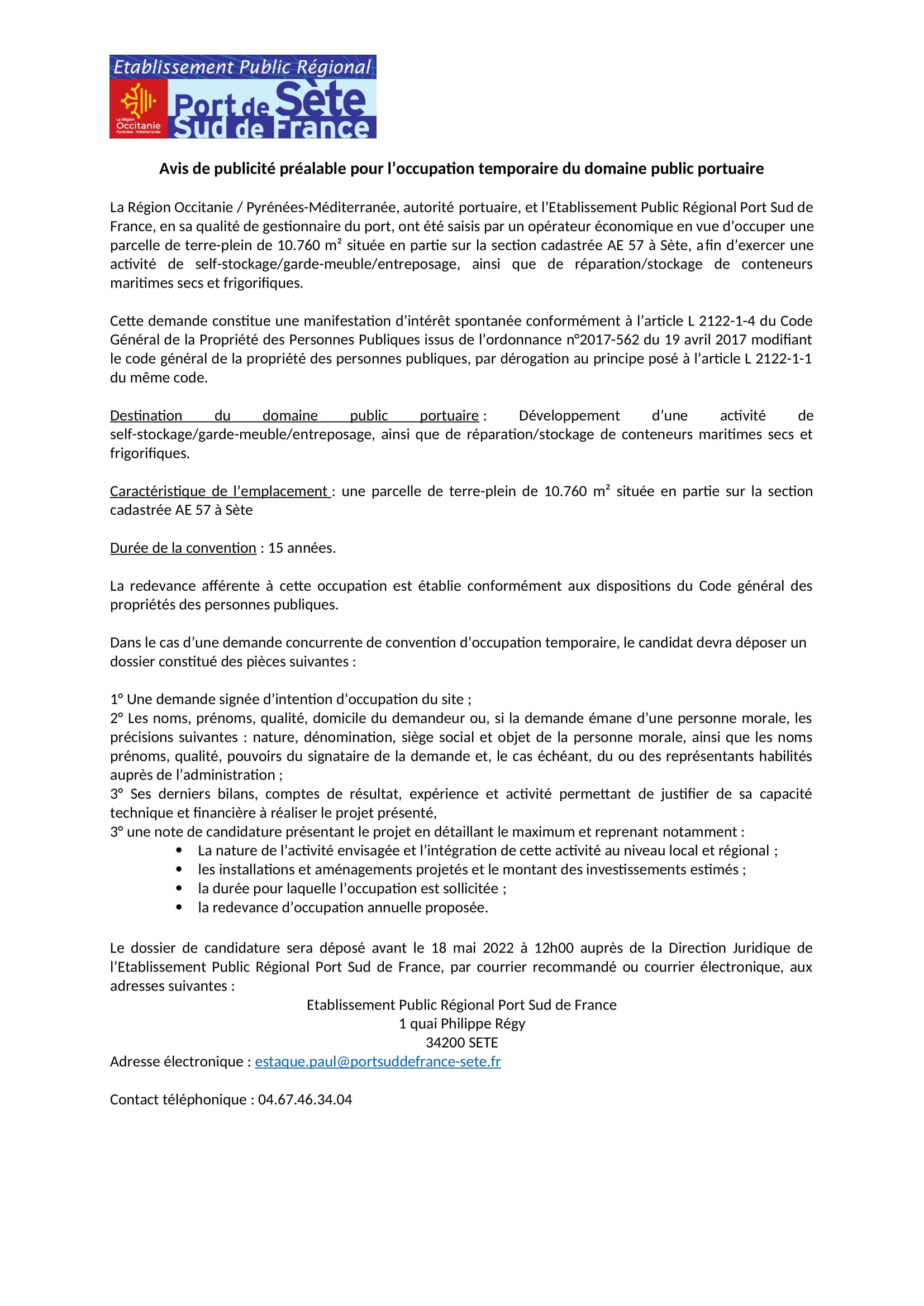 - Adresse électronique : estaque.paul@portsuddefrance-sete.fr
