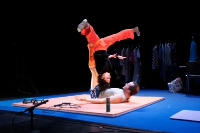 "Backstage" raconte avec décalage et empathie l'amitié entre deux artistes qui ont des milliers de kilomètres au compteur. L'action se passe en loge une heure avant l'entrée en scène d'un duo de portés acrobatiques. Dans ce moment de préparation intense, on découvre une voltigeuse volubile et un porteur en quête de charisme. L'écriture oscille entre routine (extraordinaire) d'échauffement et digressions plus ou moins en lien avec l'urgence du spectacle qui approche.