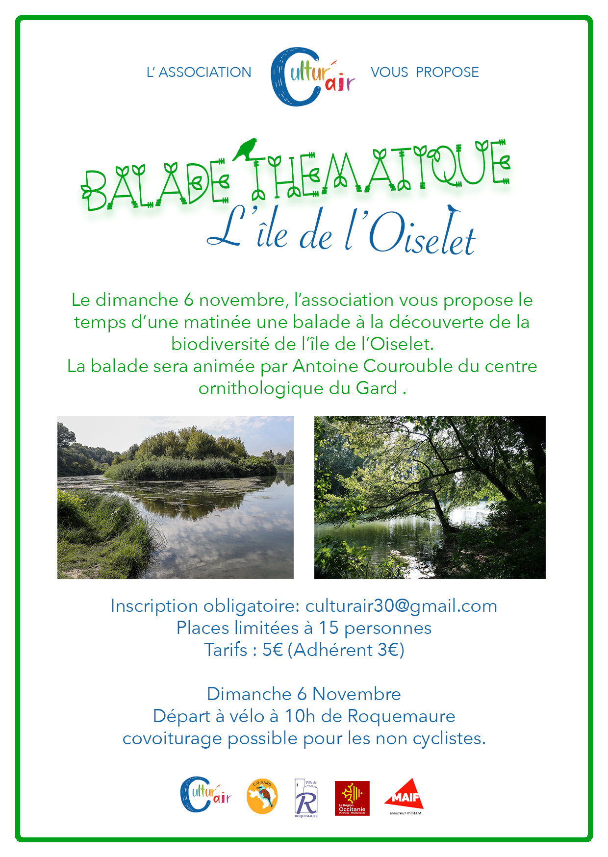 Le dimanche 6 novembre, l’association Cultur’air vous propose le temps d’une matinée une balade de découverte de la biodiversité de l’île de l’Oiselet. La balade sera animée par Antoine Courouble du Centre Ornithologique du Gard