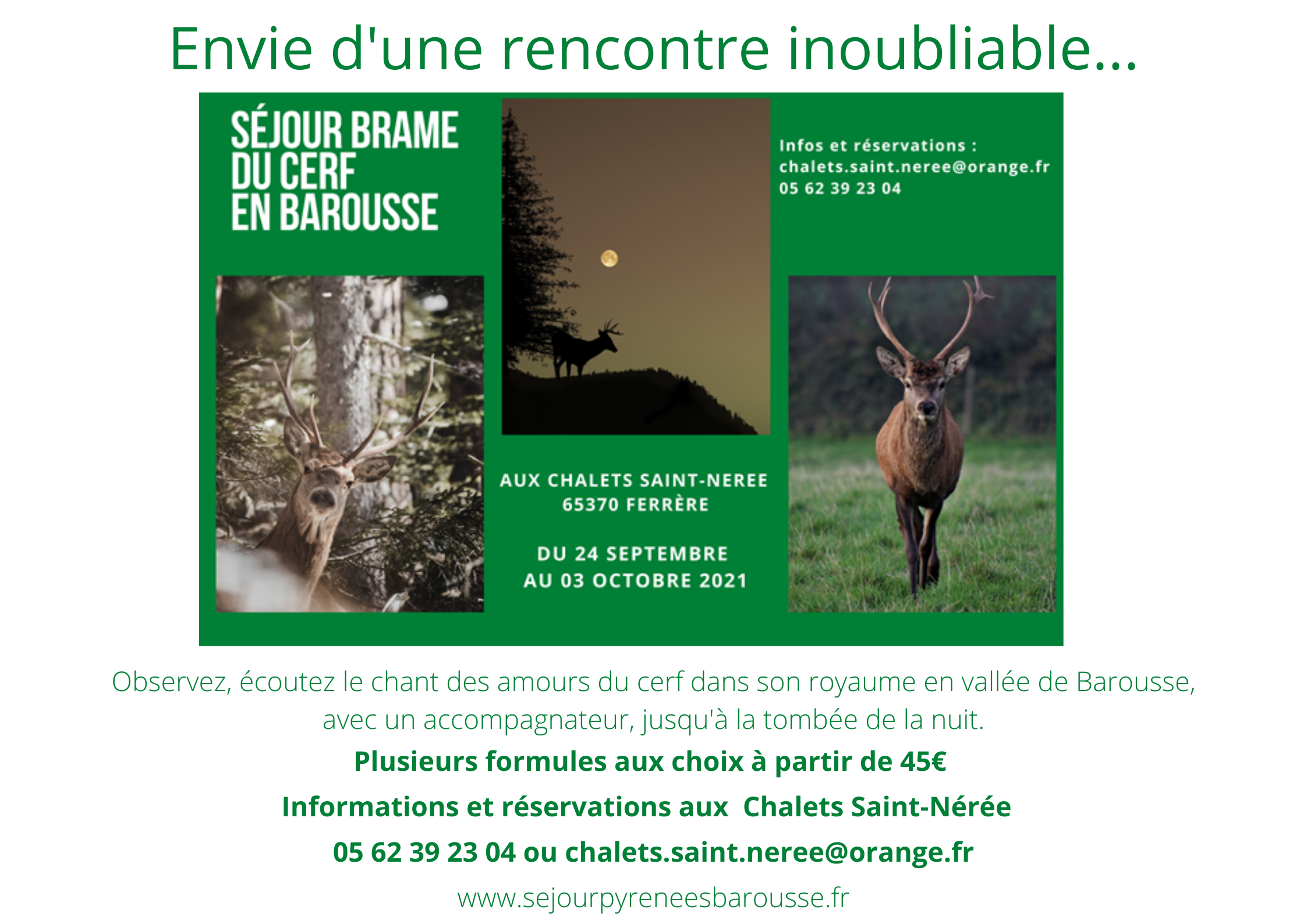 Découverte du brame dans la vallée de la Barousse accompagnée d’un guide professionnel, suivi d’un repas du terroir aux Chalets Saint-Nérée (65370 Ferrère) à partir de 45€ Renseignements et réservations 05 62 39 23 04 ou chalets.saint.neree@orange.fr