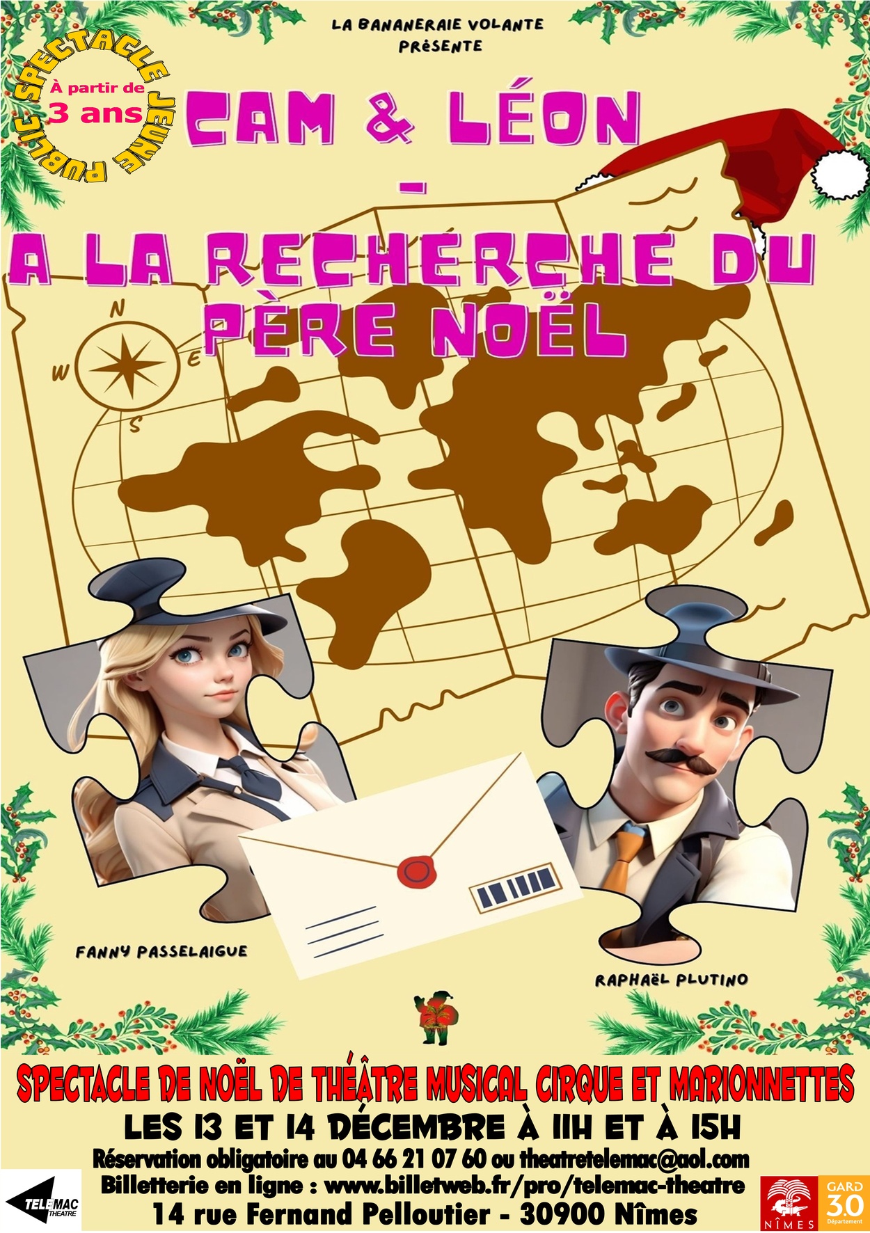 Un spectacle Noël entremêlant théâtre, cirque, marionnettes, chanson et musique pour les 3-8 ans, écrit et interprété par Fanny PASSELAIGUE et Raphaël PLUTINO, sous la forme d’une aventure sympathique, instructive et participative qui demandera aux enfants de résoudre des énigmes et d’enquêter comme de vrais petits détectives pour retrouver le Père Noël…