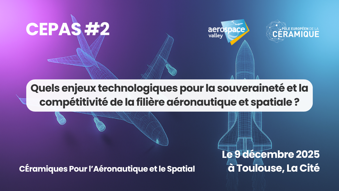 Les pôles de compétitivité Aerospace Valley et Pôle Européen de la Céramique ont le plaisir de vous convier à la 2ème édition de CÉPAS - CÉramiques Pour l’Aéronautique et le Spatial, qui se tiendra le 9 décembre 2025 à Toulouse, à La Cité, sur le thème : "Quels enjeux technologiques pour la souveraineté et la compétitivité de la filière aéronautique/spatiale ?"
