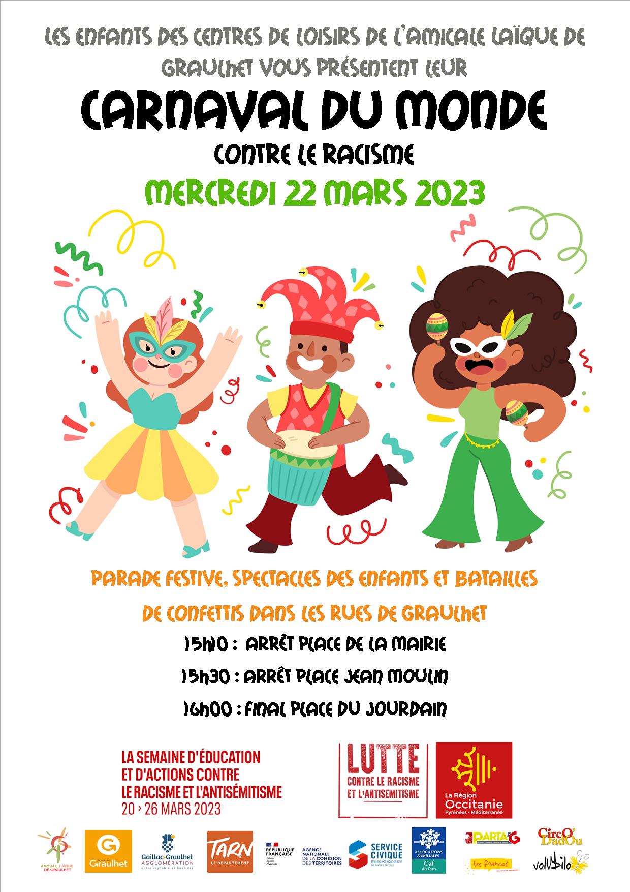 L’ensemble des productions issues des ateliers viendront ponctuer le cortège du Carnaval à travers les rues du centre-ville de Graulhet. Le défilé marquera différents temps d’arrêt sur des places publiques, pour donner à voir aux habitants la richesse et la créativité des productions. Le final aura lieu place du Jourdain, où les enfants mettront en scène le jugement de Monsieur Carnaval en leur adressant leurs messages « contre le racisme ».