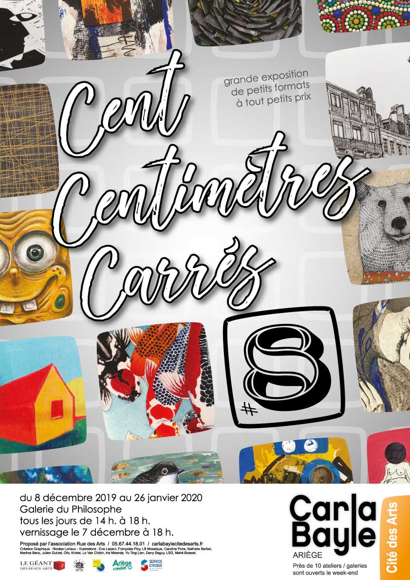Pour la huitième année l’association Rue des Arts renouvelle la proposition d’exposition dédiée aux très petits formats (10×10 cm). L’exposition aura lieu à la Galerie du Philosophe au Carla-Bayle en Ariège du 7 décembre 2019 au 26 janvier 2020.Les modalités d’inscription sont on ne peut plus simples : Il n’y a pas de sélection, il vous suffit de bien lire et de suivre les indications données dans les conditions générales et de proposer entre 7 et 15 œuvres. Le médium est indifférent du moment que sont respectées les contraintes de format et de point d’accroche.