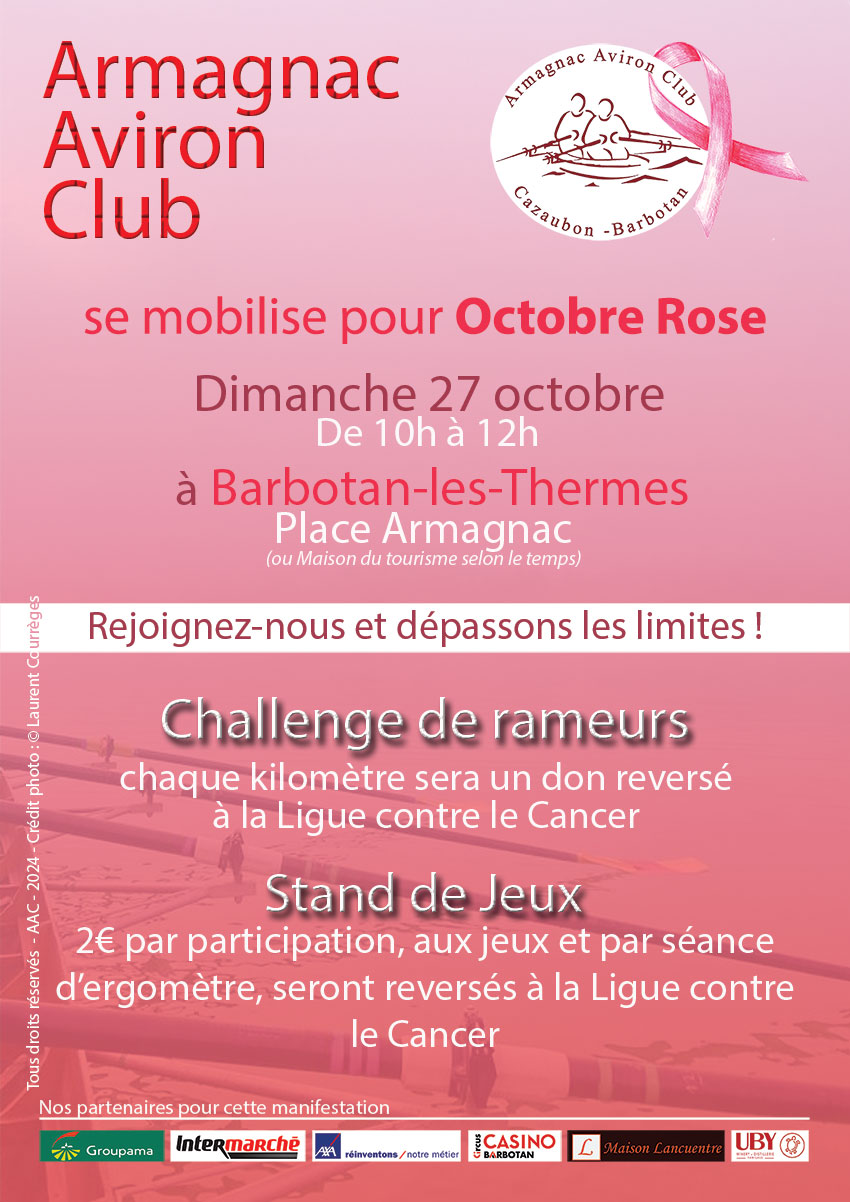 Participez à notre Challenge de rameurs : chaque kilomètre parcouru génère des fonds pour la ligue contre le cancer grâce à nos partenaires Intermarché Cazaubon, Groupama d’Oc, AXA, Maison Lancuentre.