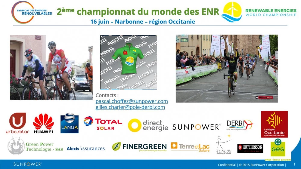 Accueil et organisation de la 2ème édition du Championnat du Monde cycliste des EnR, en partenariat avec le Vélo Sprint Narbonnais, club agrée FFC, le SER (Syndicat des Energies Renouvelables) et de nombreux sponsors privés.