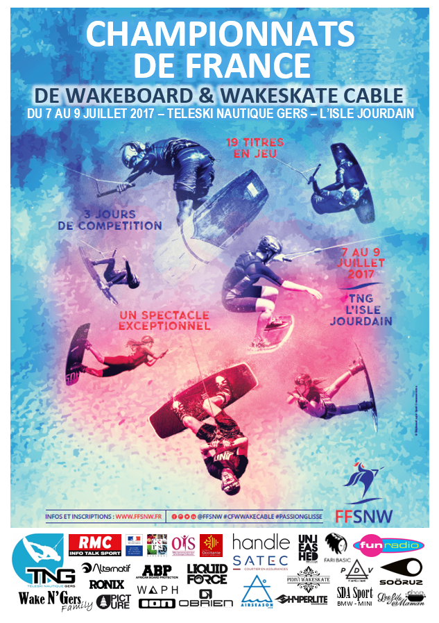 La FFSNW a confié l’organisation des Championnats de France de Wakeboard et Wakeskate Cable 2017 au club sportif Wake N’Gers. La compétition se déroulera du vendredi 07 juillet au dimanche 09 juillet 2017 sur le lac de l’Isle-Jourdain au Téléski Nautique du Gers (TNG).