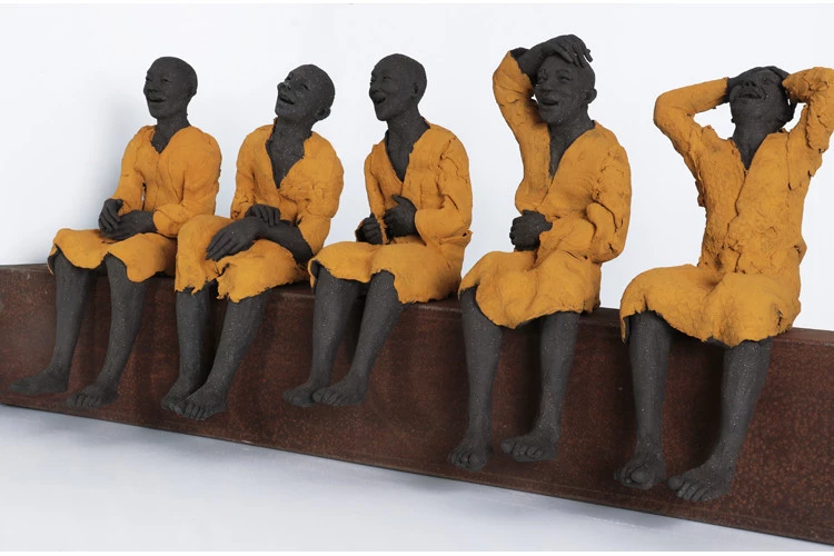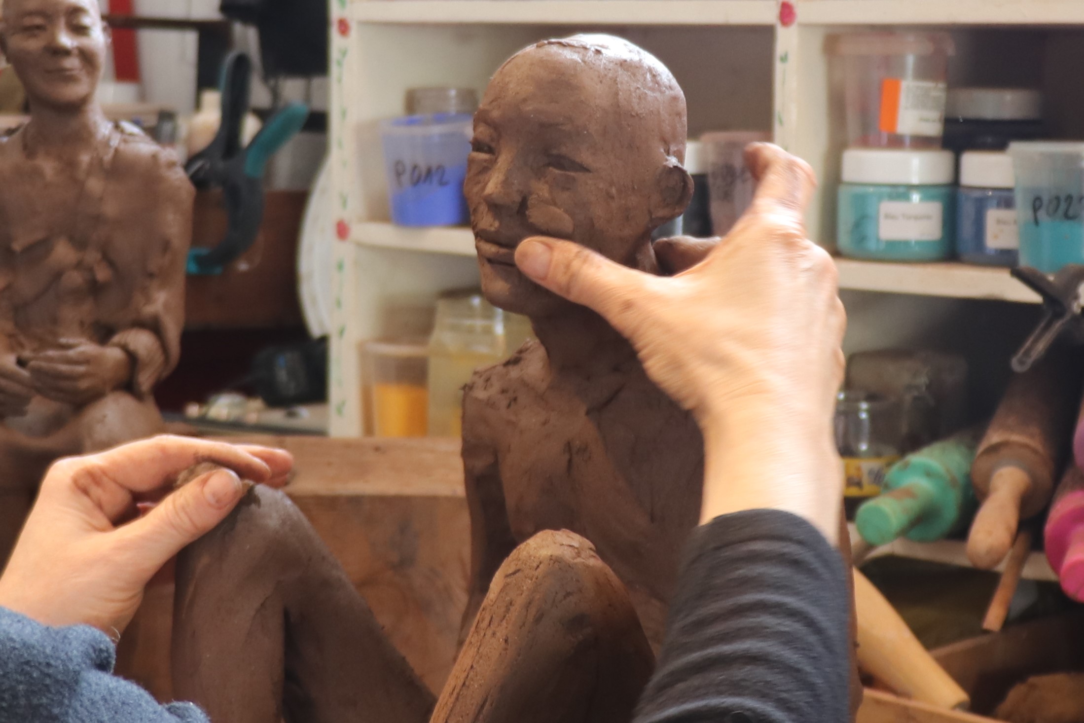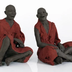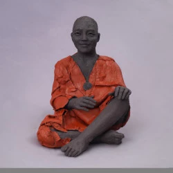 Her artistic explorations draw on emotion, human gentleness, and full-throated laughter. The little characters inspired by Buddhist monks bear witness to the best aspects of mankind. They represent the positive side that each one of us tries to cultivate. Working with clay contributes to the feeling of life and energy which the artist captures like photographic snapshots. The spectator is quickly charmed by this untamed, almost infectious laughter. Traduit par Alison Duffy