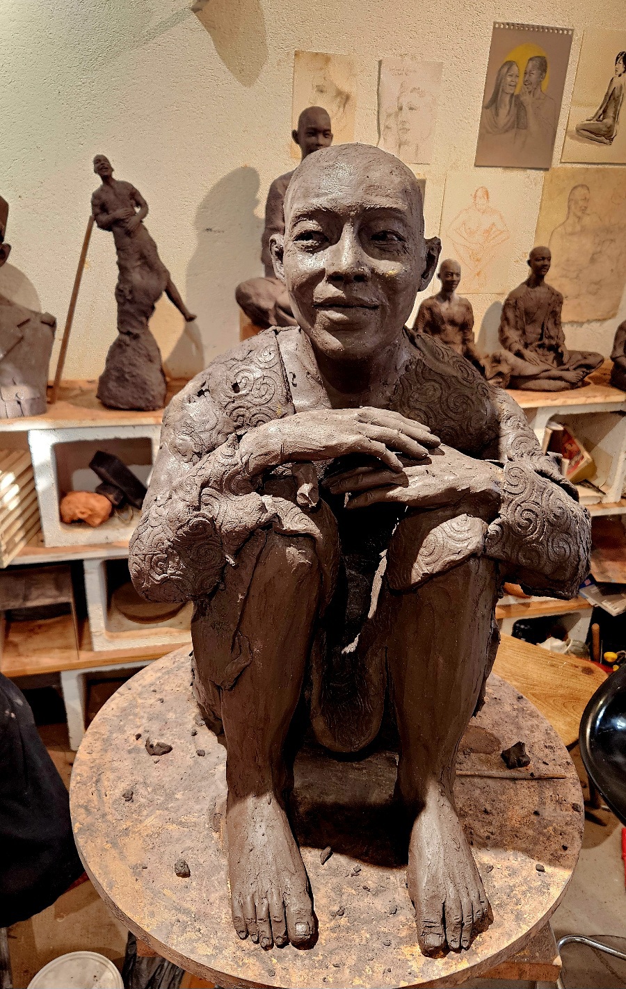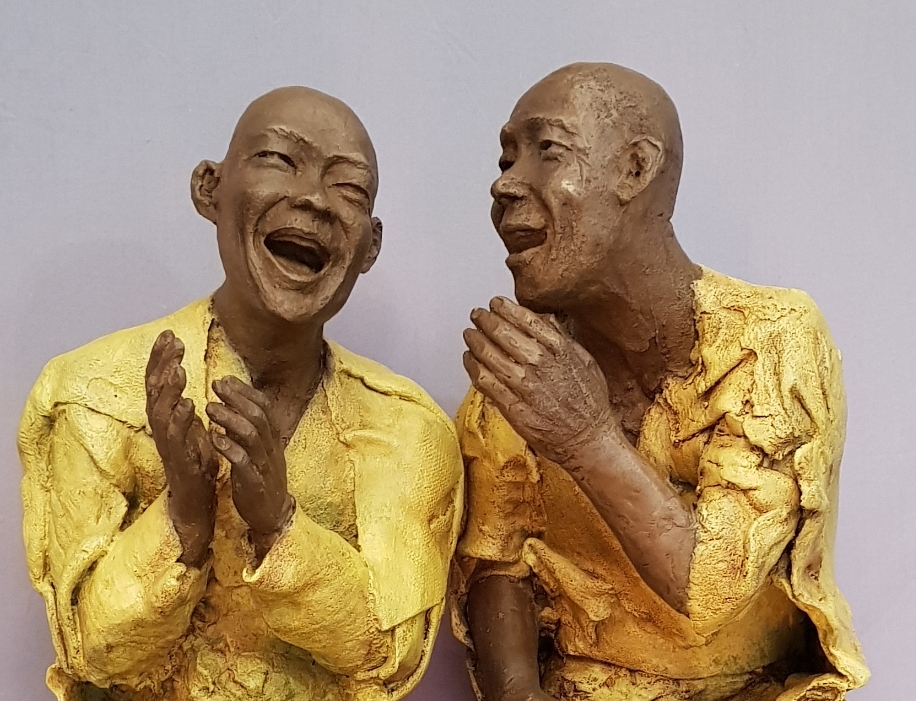 Son exploration artistique puise dans l’émotion, la douceur humaine et le fou rire. Ses petits personnages inspirés des moines bouddhistes apportent un témoignage de ce que l’homme a de meilleur. Ils représentent le côté positif que chacun d’entre nous essaie de cultiver. Le travail de la terre contribue à la sensation de vie et d’énergie que l’artiste capte comme des instantanés photographiques. Le spectateur se laisse vite séduire par ces fous rires presque communicatifs.