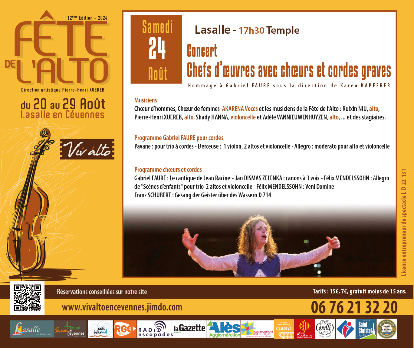 Chœur d’hommes, Chœur de femmes AKARENA Voces et les musiciens de la Fête de l’Alto : Ruixin NIU, alto, Pierre-Henri XUEREB, alto, Shady HANNA, violoncelle, Benoit LEVESQUE, contrebasse, Adèle VANNIEUWENHUYZEN, alto, … et des stagiaires.