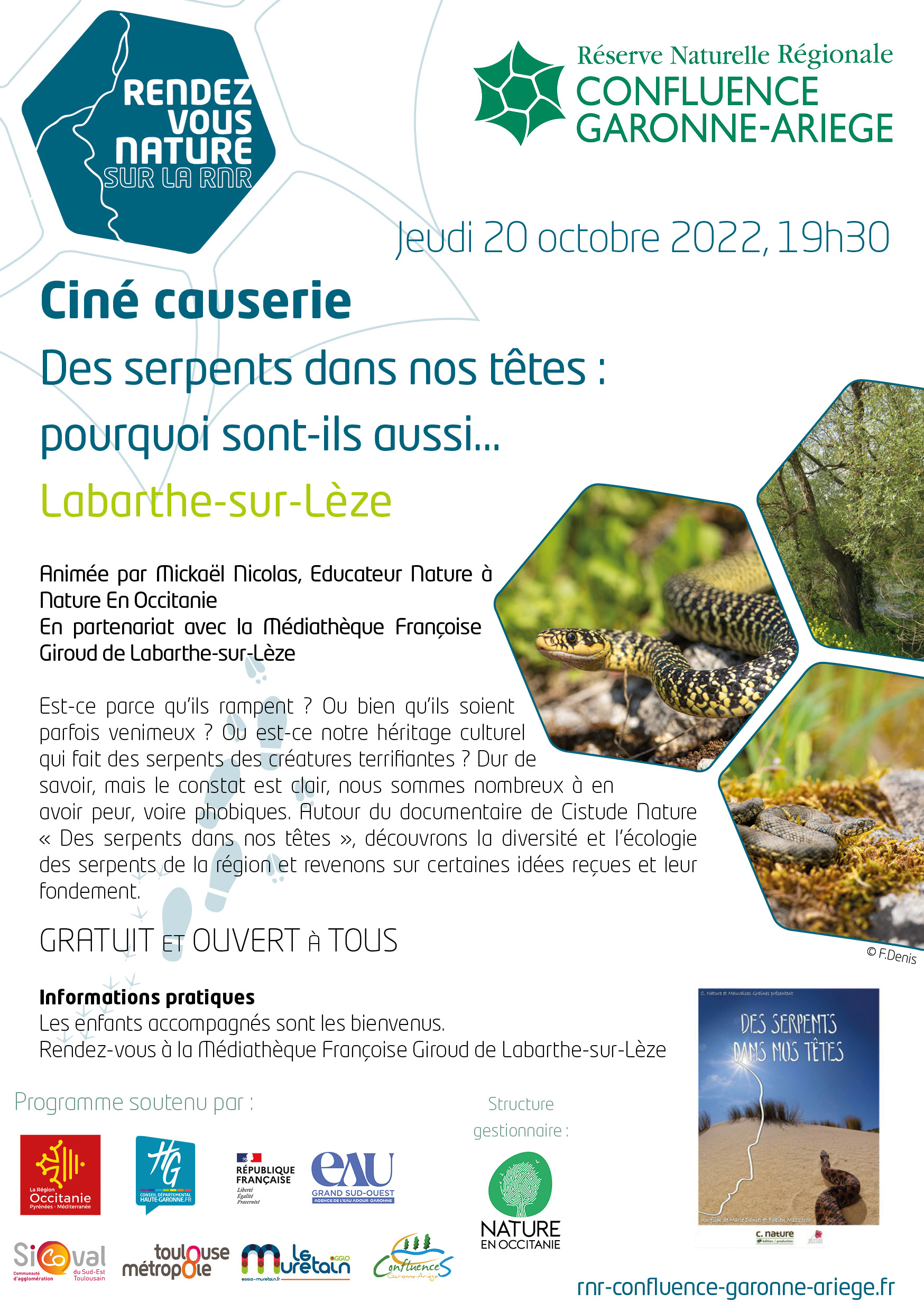 Descriptif : Est-ce parce qu’ils rampent ? Ou bien qu’ils soient parfois venimeux ? Ou est-ce notre héritage culturel qui fait des serpents des créatures terrifiantes ? Dur de savoir, mais le constat est clair, nous sommes nombreux à en avoir peur, voire phobiques. Autour du documentaire de Cistude Nature « Des serpents dans nos têtes », découvrons la diversité et l’écologie des serpents de la région et revenons sur certaines idées reçues et leur fondement.