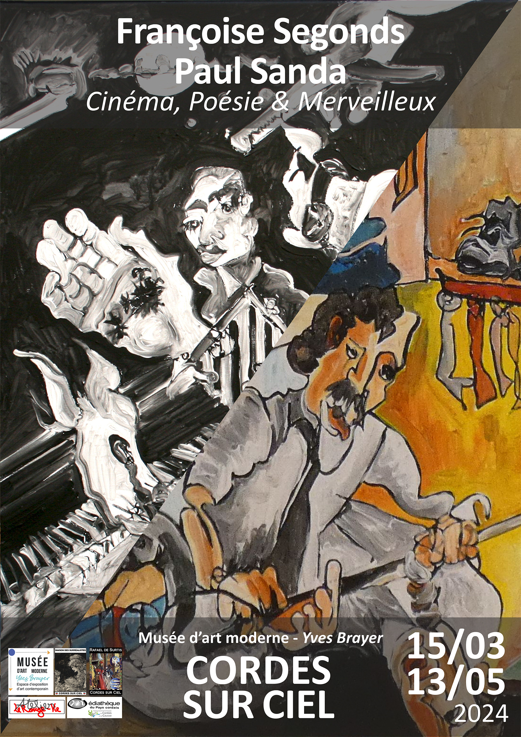 Après un travail réalisé autour des peintres du mouvement surréaliste qui ont dialogué avec Cordes – Feux de Braise (Rafael de Surtis éditions & Atelier Le Rouge-Vie) – produit en 2022 pour le huitième centenaire de la Cité, Françoise Segonds et Paul Sanda ont entamé une création dialoguée d’environ 80 œuvres, dont l’essentiel sera visible au Musée d’Art Moderne Yves-Brayer pour cette grande exposition intitulée Cinéma, Poésie & Merveilleux, qui révélera la complicité des approches picturales & poétiques communes des deux artistes pour aborder le Septième Art. Cette exposition est dédié au Manifeste du surréalisme d’André Breton, dont c’est l’année du centenaire, André Breton qui fréquentait Cordes dans les années 50.