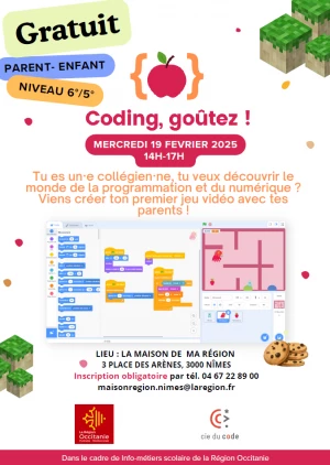 La Compagnie du Code, coopérative d’éducation populaire basée à Toulouse, organise deux Coding Goûters parents-enfants dans les Maisons de Région de Nîmes et Alès le mercredi 19 février de 14h à 17h. Ces actions sont gratuites pour les bénéficiaires et organisées dans le cadre de l’AAP Infos Métiers Scolaire 2024-25 porté par la Région Occitanie.