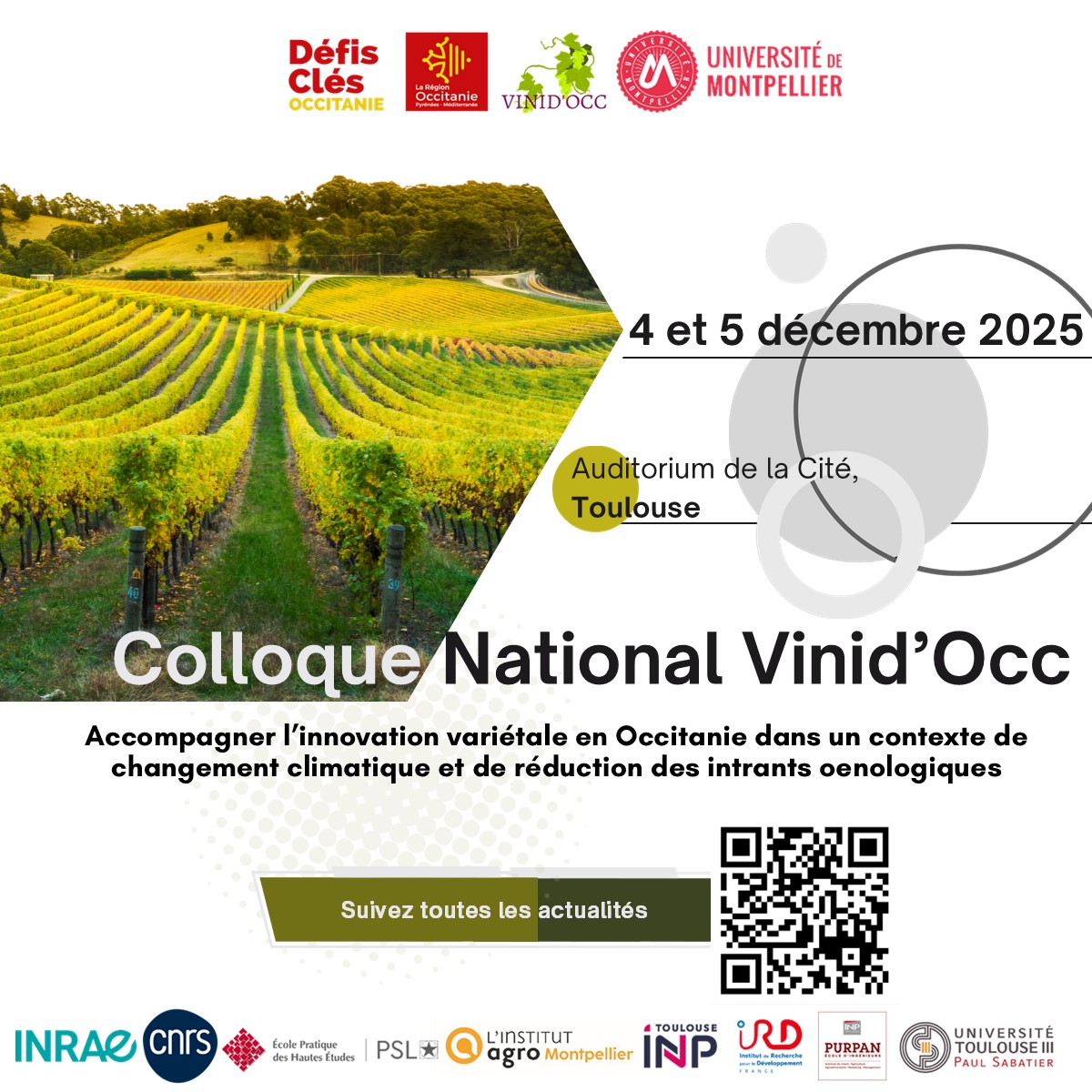 Le Défi Clé Vinid’Occ aura le plaisir de vous accueillir les 4 et 5 décembre 2025 à La Cité à Toulouse pour son colloque scientifique national. Cet évènement se positionne sur la thématique de l’accompagnement de l’innovation variétale dans un contexte de changement climatique et de réduction des intrants à la vigne et au chai.