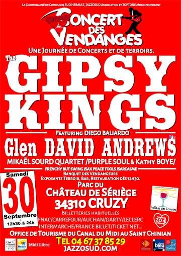 Une journée de concerts et de terroirs avec les concerts de The GIPSY KINGS, Glen David ANDREWS (USA), MICKAËL SOURD QUATUOR, Kathy BOYE & PURPLE SOUL, FRENCHY BUT SWING, SARCASM et SAX PEACE TOOLS. Stands terroirs et produits régionaux, bars et restaurations.