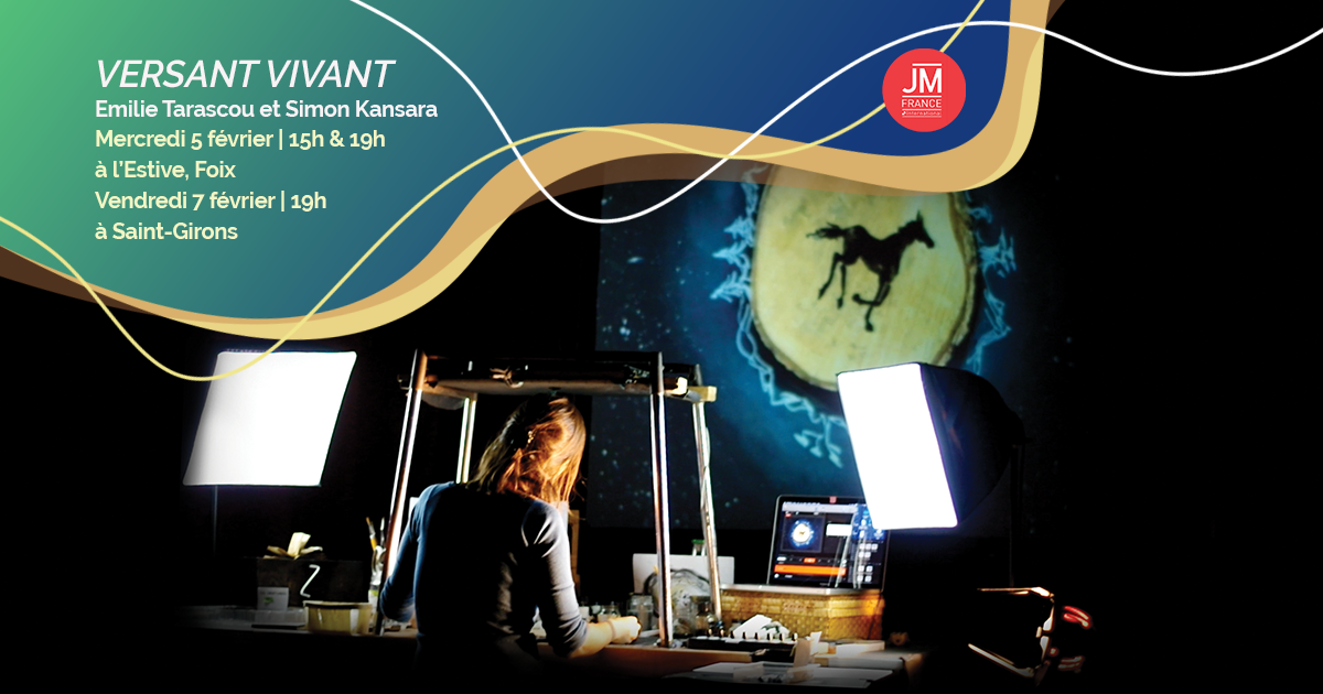 Versant Vivant est un spectacle musical, sensible et contemplatif, qui mélange les compositions électro-acoustiques de Simon Kansara et une variété de créations plastiques réalisées en direct par Emilie Tarascou. Le dialogue entre musique et dessin animé invite l’imaginaire à voyager à la rencontre des vivants qui peuplent la montagne.