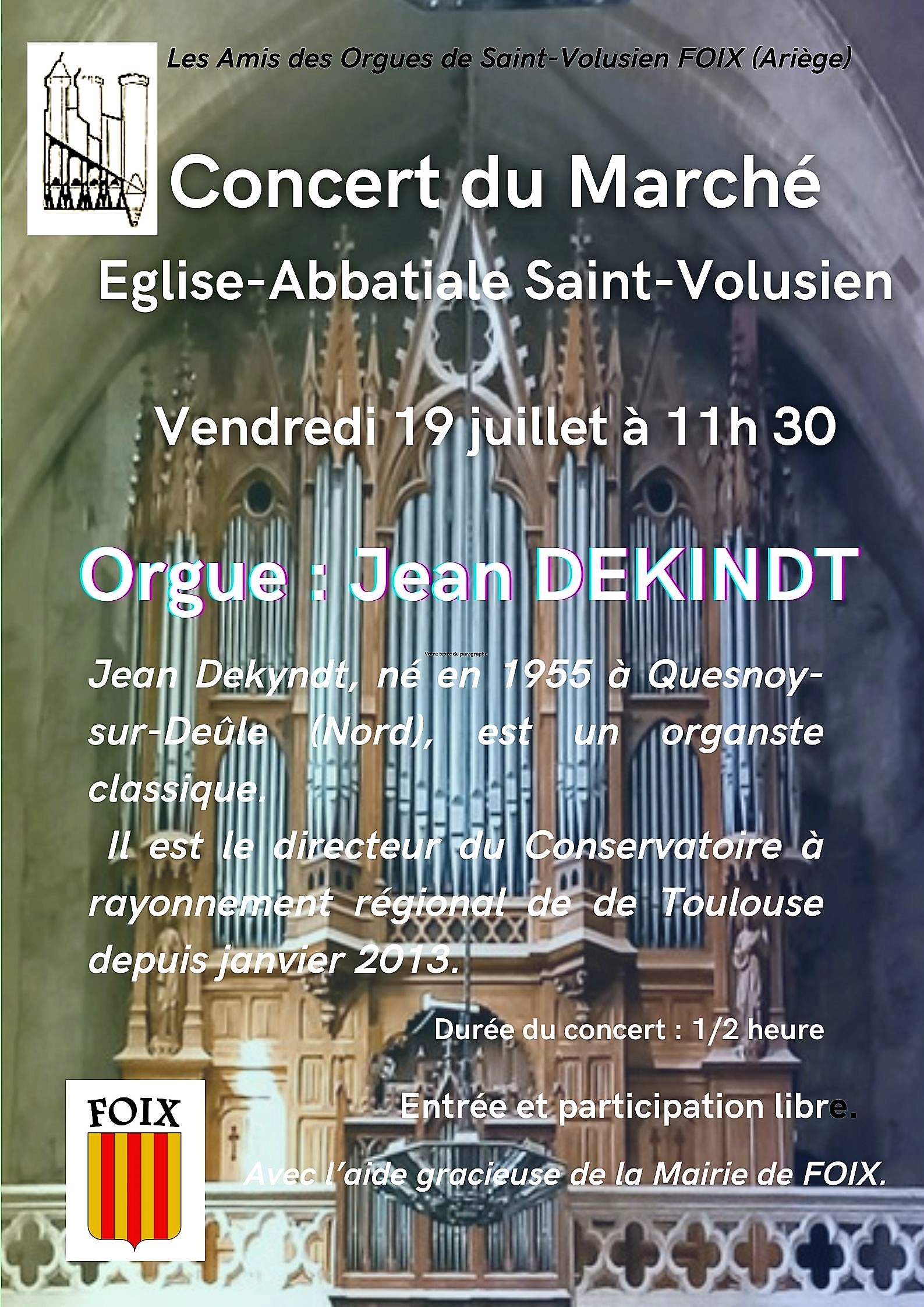 Les Amis des Orgues de Saint-Volusien, église-abbatiale de FOIX 09, proposent un concert chaque vendredi de Juillet et d’Aoüt à 11 h 30