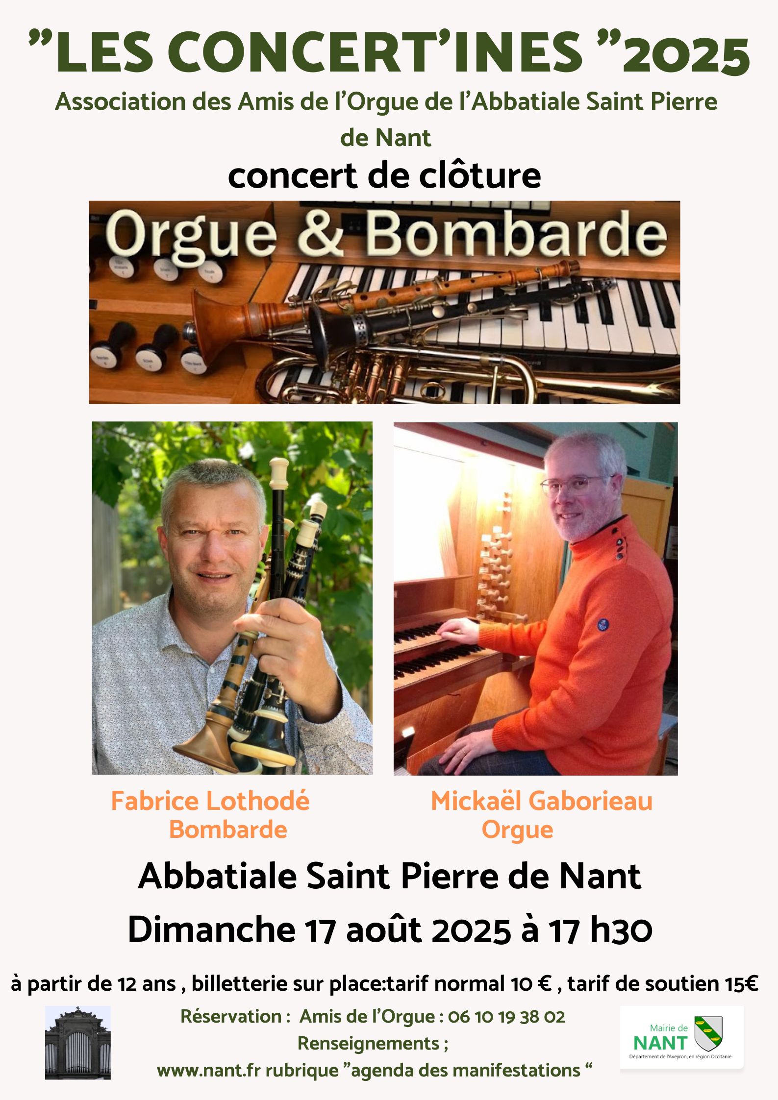 LES CONCERT’INES 2025 « Concert de clôture » DUO BOMBARDE /ORGUE avec Fabrice LOTHODE et Mickaël GABORIEAU . Après les 5 concerts qui ont émaillé les dimanches des Concert’ines , l’Association des Amis de l’Orgue de l’Abbatiale Saint Pierre de Nant vous invite à prendre « un air de Bretagne » ,