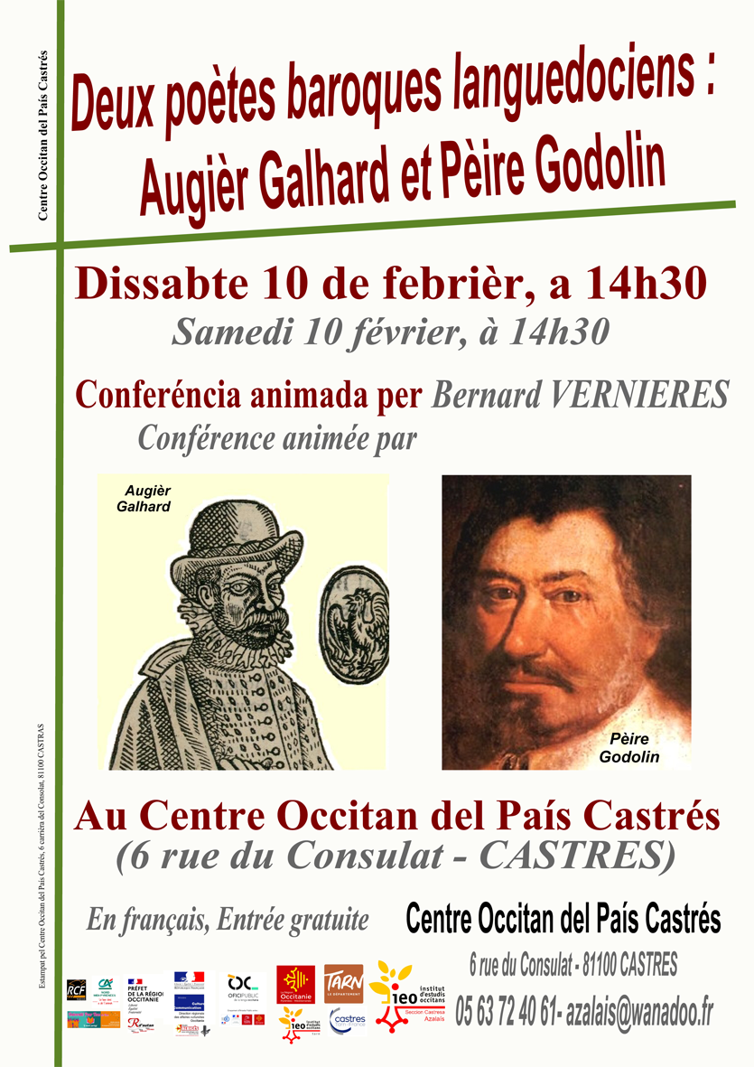 Bernard Vernières viendra nous présenter une conférence sur deux poètes baroques languedociens, Augièr Galhard et Pèire Godolin, le samedi 10 février 2024, à 14h30, au Centre Occitan del País Castrés (6 rue du Consulat - 81100 Castres).
