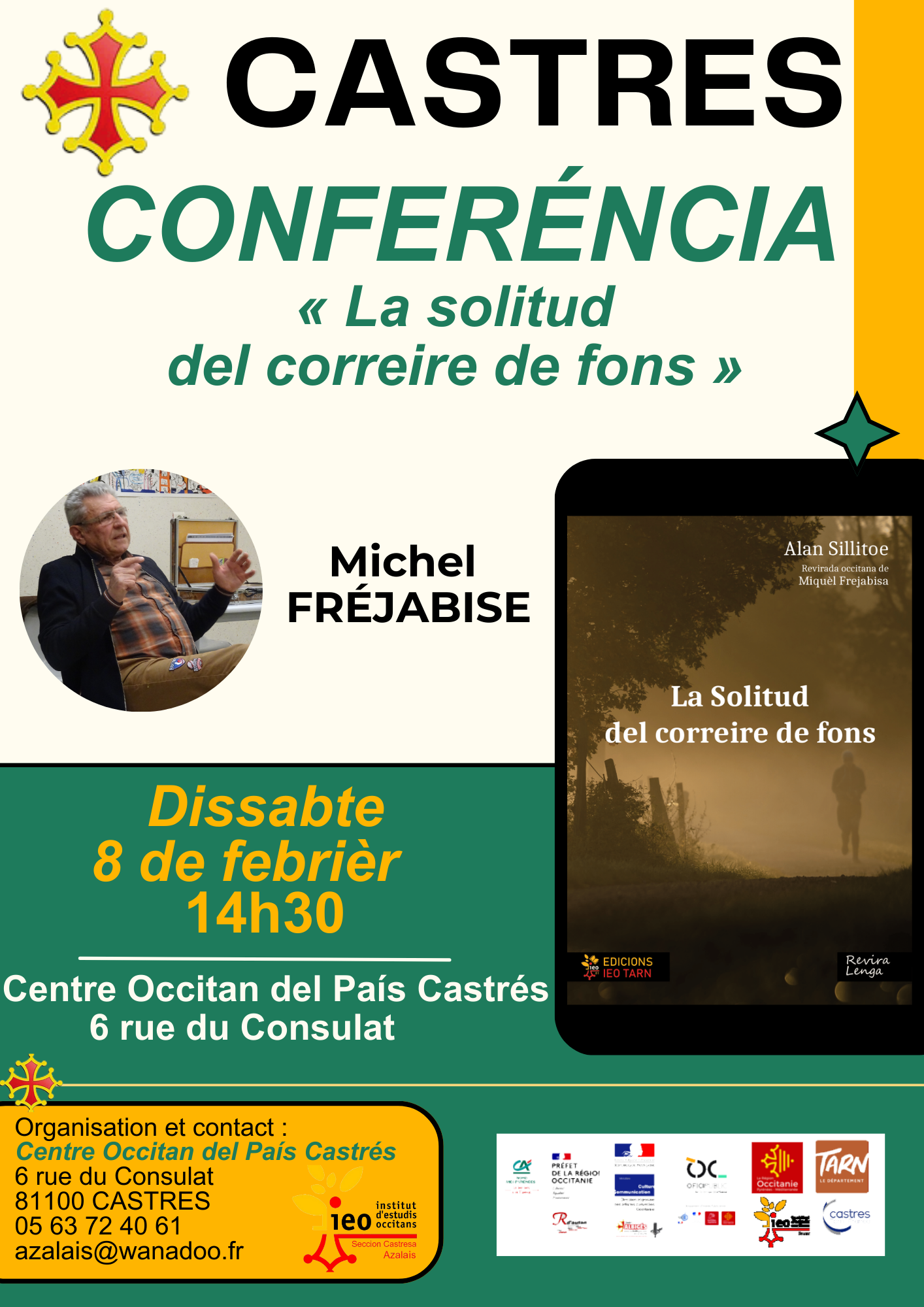 Michel FRÉJABISE viendra nous présenter sa conférence-diaporama « La solitud del correire de fons », le samedi 8 février 2025, à 14h30, au local du Centre Occitan del País Castrés (6 rue du Consulat - 81100 Castres).