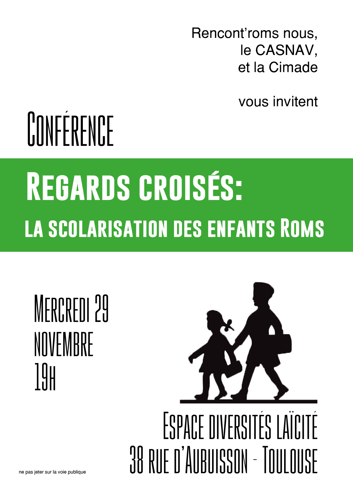 Suite à une journée de rencontres professionnelles, réunissant enseignants, chefs d’établissement, travailleurs sociaux,associations, assistantes sociales, jeunes Roms, etc., l’association Rencont’roms nous, le CASNAV de l’académie de Toulouse et La Cimade Toulouse s’associent pour vous proposer une conférence, qui a pour objectif de revenir sur ce sujet auprès du grand public et d’en présenter les principales problématiques, avec un focus sur la situation à Toulouse.