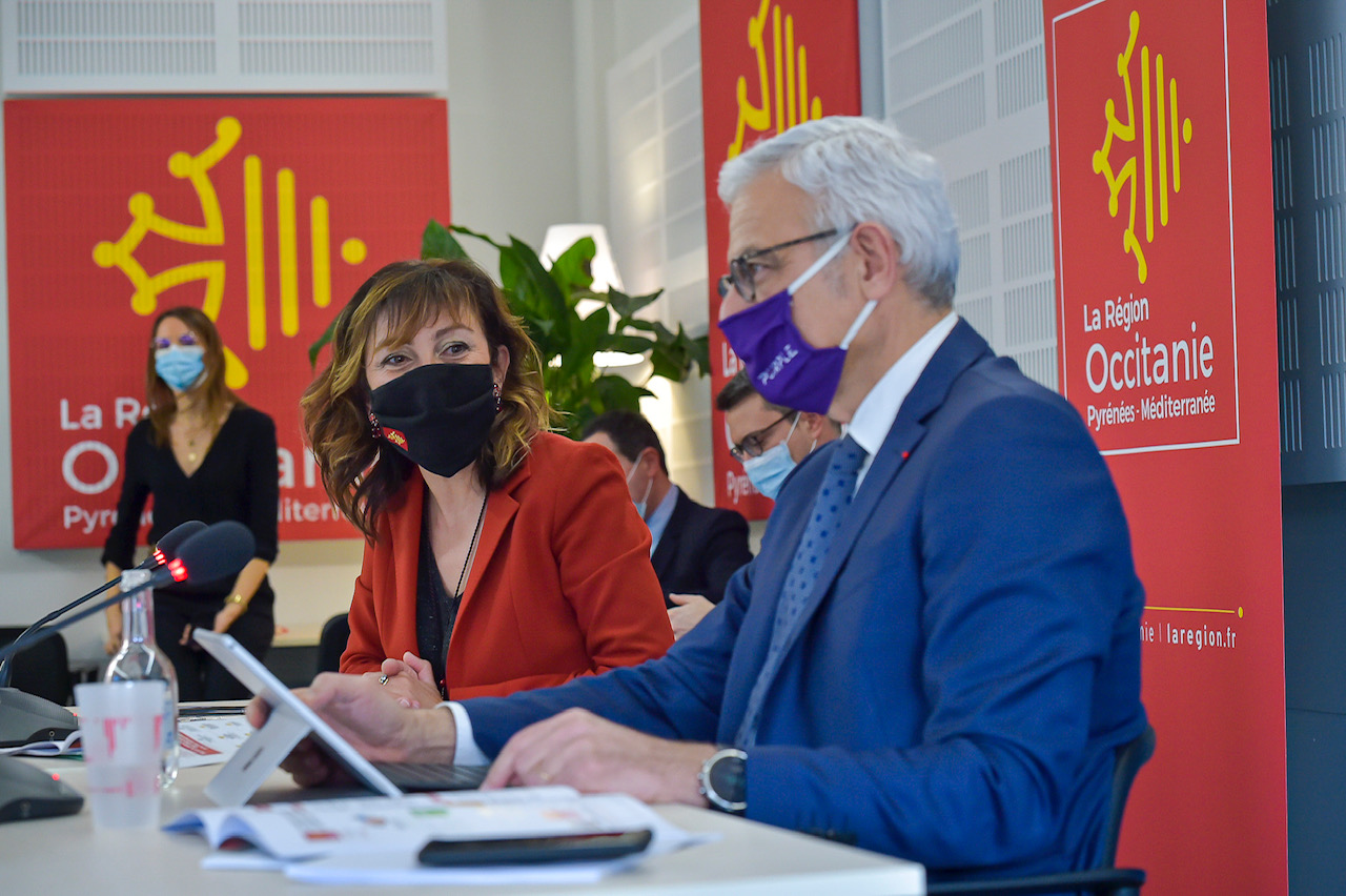 Carole Delga, présidente de la Région Occitanie / Pyrénées-Méditerranée et Alain Di Crescenzo, président de la Chambre de Commerce et d’Industrie d’Occitanie ont tenu aujourd’hui une conférence de presse pour présenter un bilan de l’ensemble des mesures prises de façon coordonnée par la Région et la CCI Occitanie depuis le début de la crise pour soutenir les entreprises, préserver les emplois ainsi que les compétences et les activités du territoire.