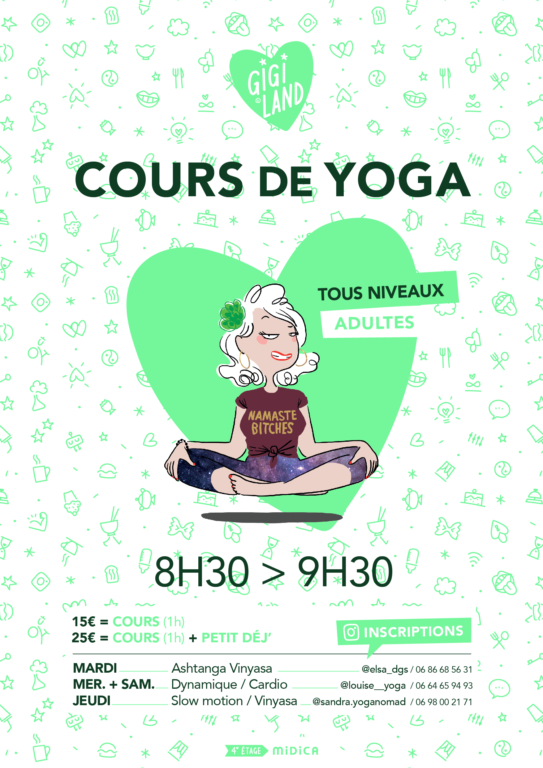 Réveil des muscles, remise en forme… rendez-vous chez Gigiland tous les mercredis et samedis pour 1h de yoga dynamique au 4ème étage de chez Midica !