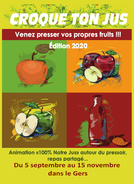 L’opération « Croque ton jus » permet aux particuliers et agriculteurs de transformer leurs pommes, mais aussi poires et coings en jus de fruit pasteurisé. Le pressoir ambulant fait escale dans 16 lieux de petites communes du Gers et des départements limitrophes, du 12 septembre au 7 novembre 2020. Les journées de pressage sont accompagnées de repas et/ou animations artistiques.