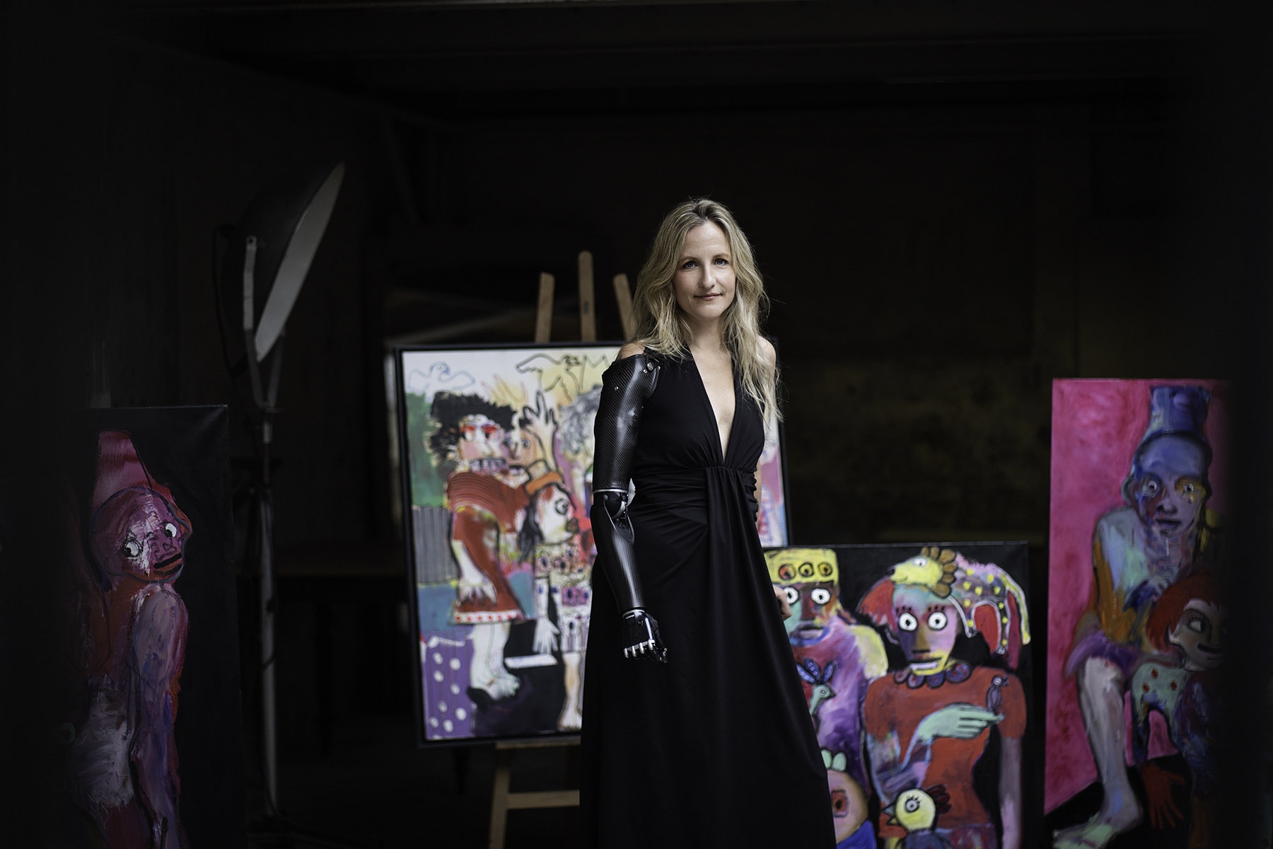 Triple amputée depuis 19 ans, elle a choisi le côté lumineux de la lune, celui où elle s’exprime sans s’inquiéter du regard de l’autre. C’est une battante, une femme libre, sa peinture est à son image, pleine de cicatrices, pleine de joie, pleine de vie.