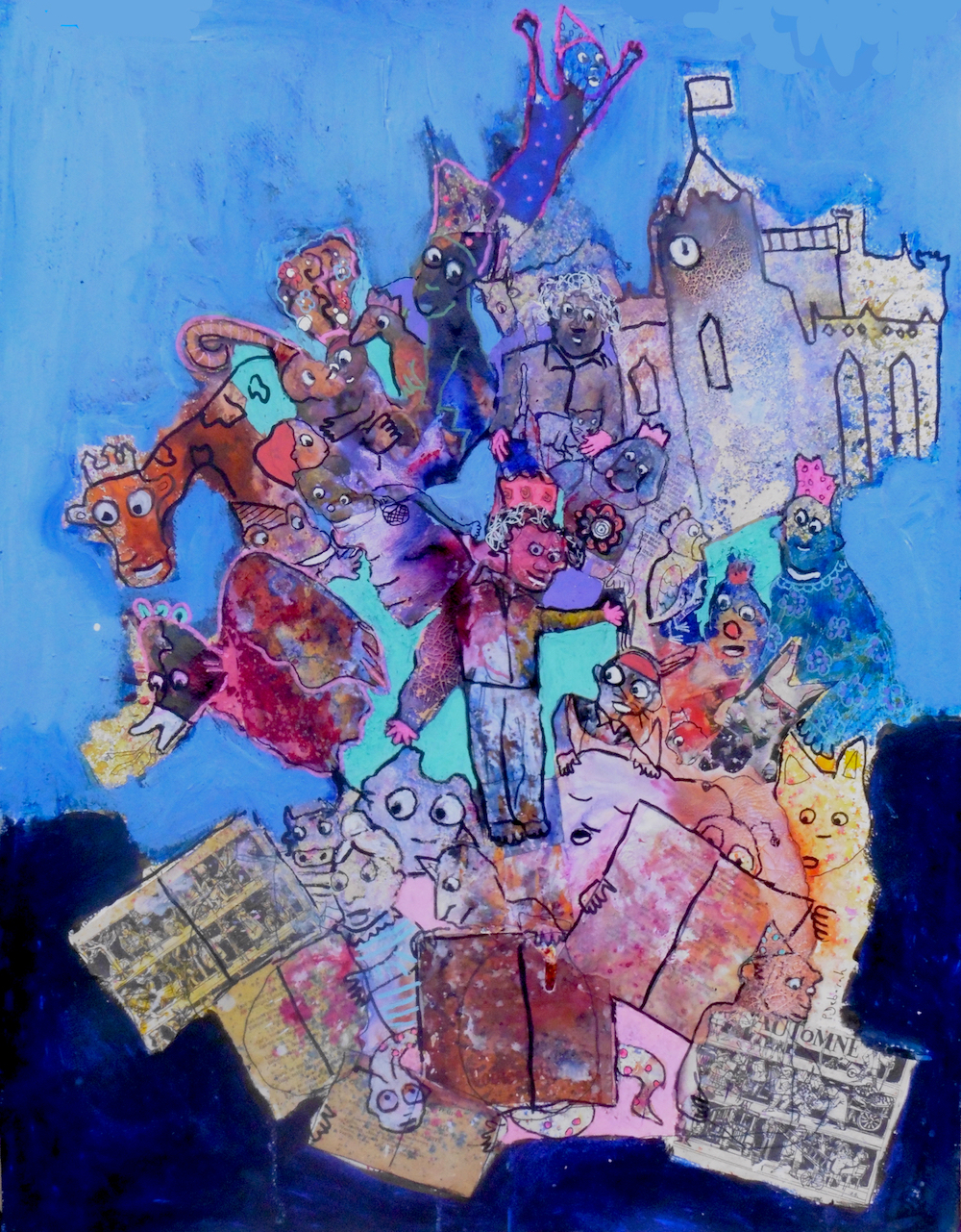 Sa peinture pénètre les tréfonds de l’histoire individuelle pour atteindre les racines de l’humanité. La silhouette humaine est omniprésente dans ses toiles ou ses encres mais elle est multiforme. Ses personnages à tête d’animal, avec 2, 3 ou 4 membres, enfants et adultes sont ici à la fête, à moins que ce soit une danse macabre ?