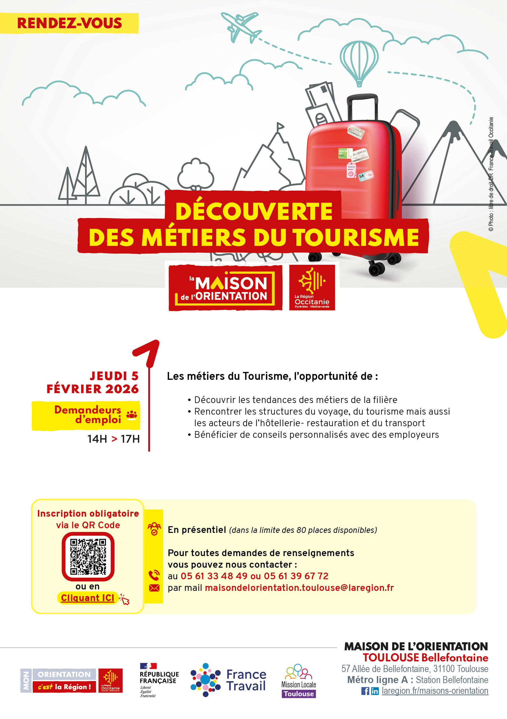 En présentiel (dans la limite des 80 places disponibles) sur inscription https://www.laregion.fr/Decouverte-des-metiers-du-tourisme-fev26