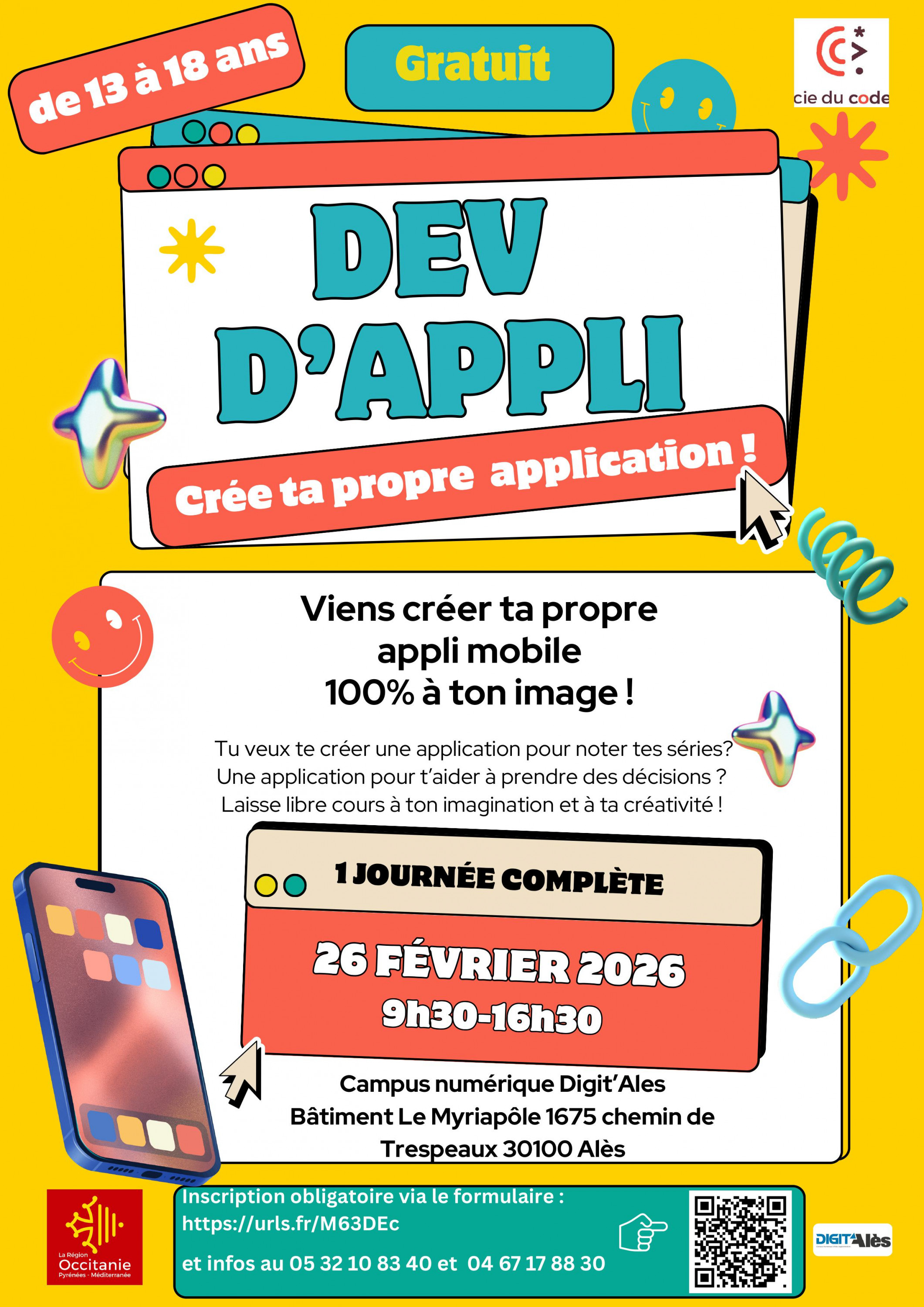 À travers cet atelier, les jeunes, en groupe de 8 maximum, développeront une application mobile simplifiée, directement testable et téléchargeable sur leur téléphone. Cette expérience concrète leur permettra de comprendre les logiques de conception et de programmation propres aux applications mobiles, tout en démystifiant ce domaine.