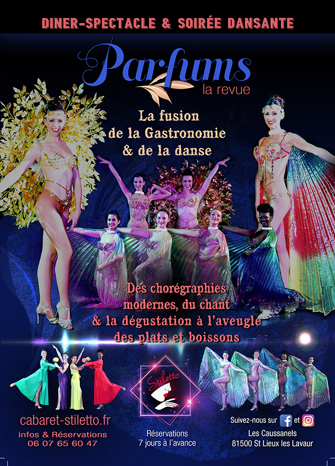 La Revue Parfums de la compagnie Stiletto est un dîner spectacle éblouissant qui dilate vos pupilles et vos papilles et vous transporte dans un voyage multisensoriel où performance artistique et sensualité des danseuses se mêlent aux saveurs et arômes des dégustations.