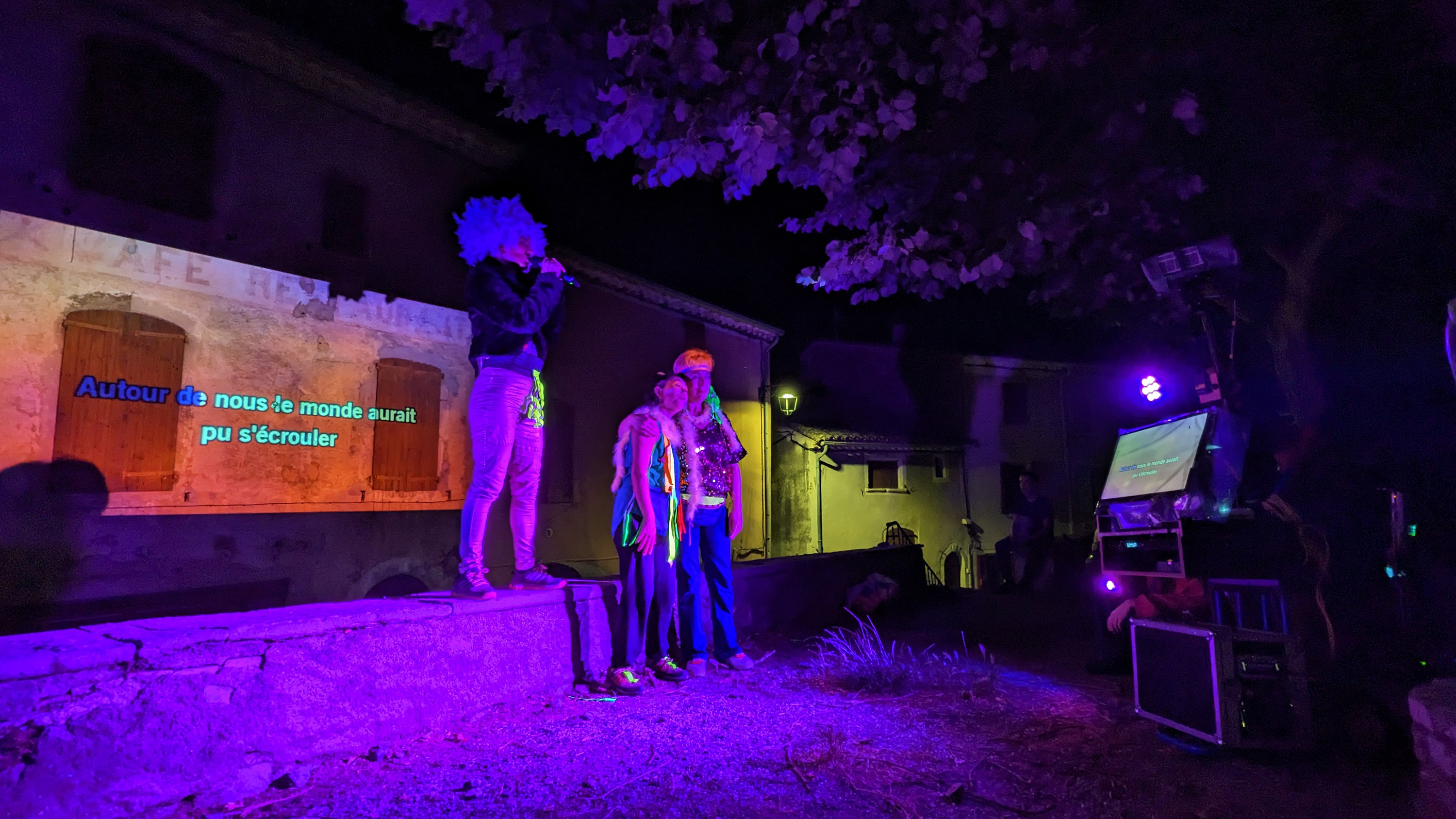 Parade pop karaokédansée pour espace public avec répertoire éclectique : chansons populaires, textes essentiels et élans chorégraphiques. Défilé rétro-futuriste pour fêter ensemble un passé retrouvé et les grands soirs qui arrivent. Une forme brute et légère avec un dispositif sonore et vidéo mobile qui se déroule à la tombée de la nuit, en deux parties : la première en déambulation, la seconde fixe sur une place. En amont : ateliers chants, chorégraphies et création de costumes.