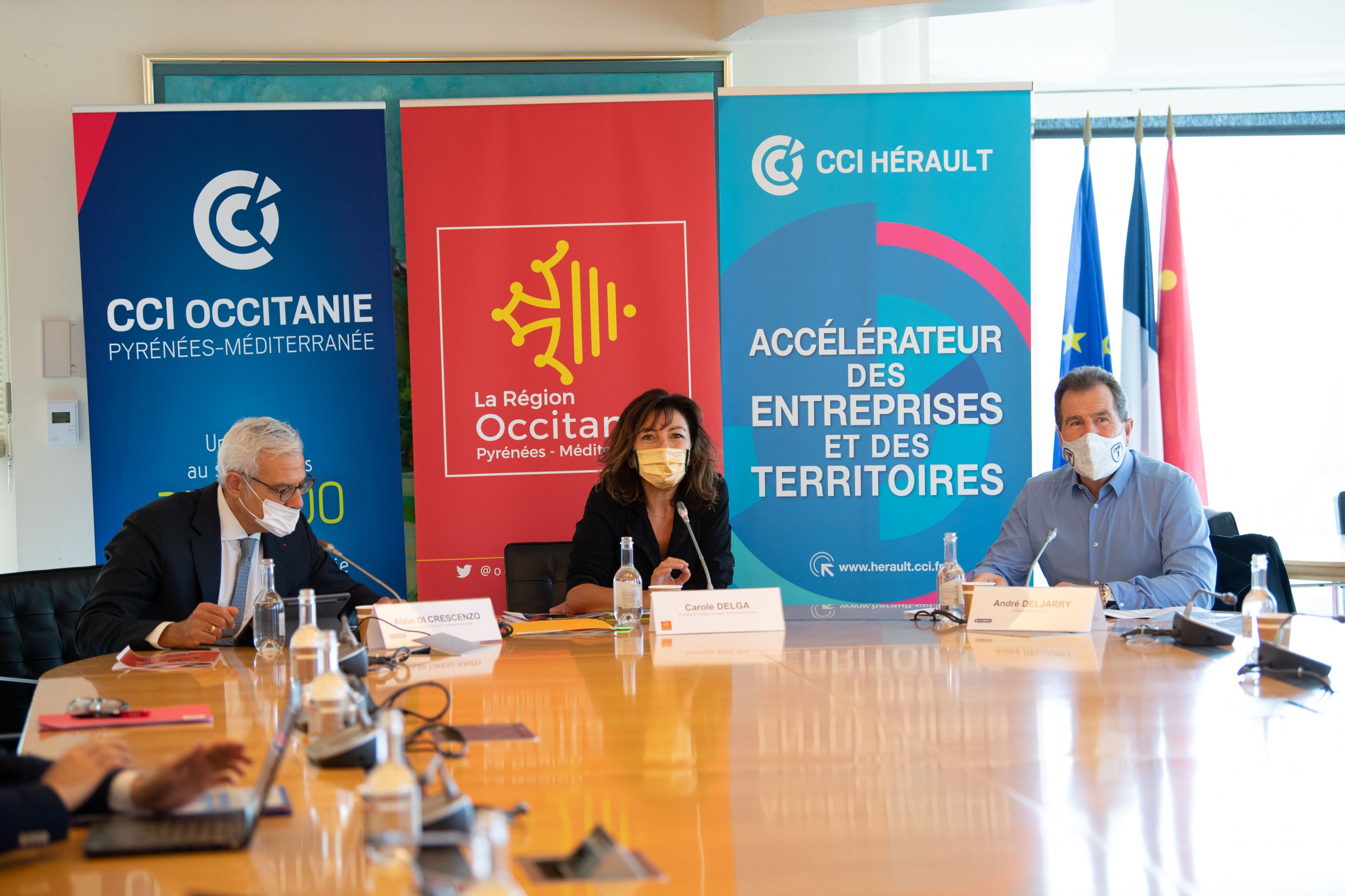 Depuis le début de la pandémie de Covid-19, Carole Delga, présidente de la Région Occitanie / Pyrénées-Méditerranée, Alain Di Crescenzo, président de la Chambre de Commerce et d’Industrie d’Occitanie et André Deljarry, président de la Chambre de Commerce et d’Industrie Hérault, 1er vice-président de la CCI Occitanie travaillent en partenariat et se mobilisent afin d’accompagner les entreprises du territoire et leurs salariés. Ils ont présenté aujourd’hui lors d’une conférence de presse l’ensemble des mesures prises de façon coordonnée pour soutenir le commerce, l’artisanat, le tourisme et l’événementiel, particulièrement touchés par les fermetures imposées par ce nouveau confinement.