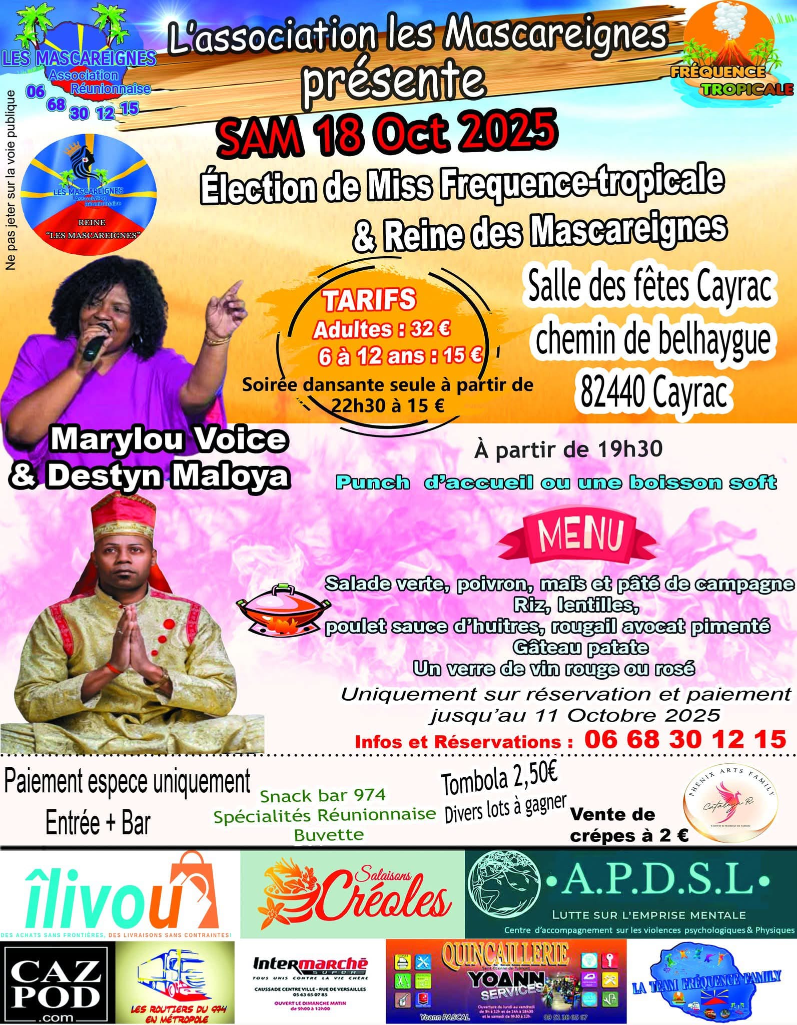 Venez nombreux à l’élection de Fréquence Tropicale & Reine De Mascareignes le 18 Octobre 2025 à CAYRAC, la soirée et l’ambiance démarrent à partir de 19h30 à la salle des fêtes de CAYRAC (82), CHEMIN DE BELHAYGUE 82440. Votre Programme sera riche tout au long de la soirée animée en coeur, vous allez danser le sega, le maloya avec les artistes réunionnais qui vont faire le déplacement spécialement pour ambiancer toute la nuit en compagnie des DJs de FRÉQUENCE TROPICALE, La Radio du soleil.